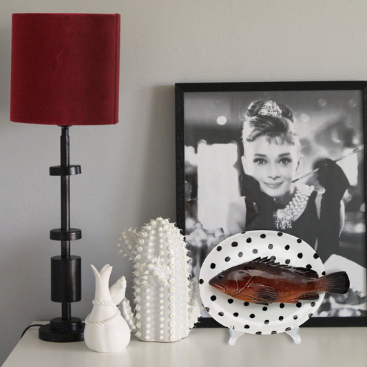 Cernia medio op een ovaal wit met zwarte stippen bord, 22X19 cm