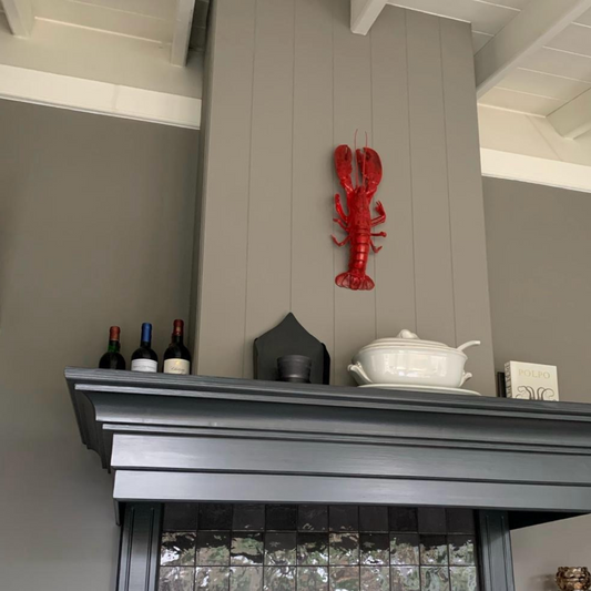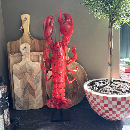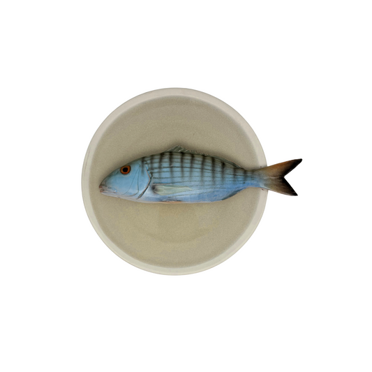 Koraal piccolo met sardientje op wit bord met blauwe verfspetters, 21 cm rond.