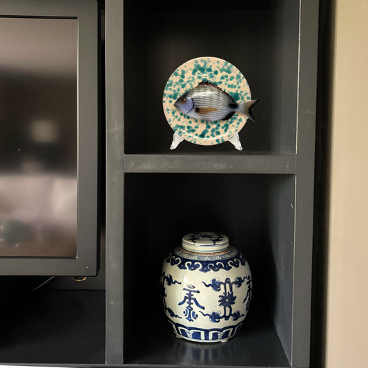 Sarago medio op créme met turquois verfspatten bordje, 16 cm rond