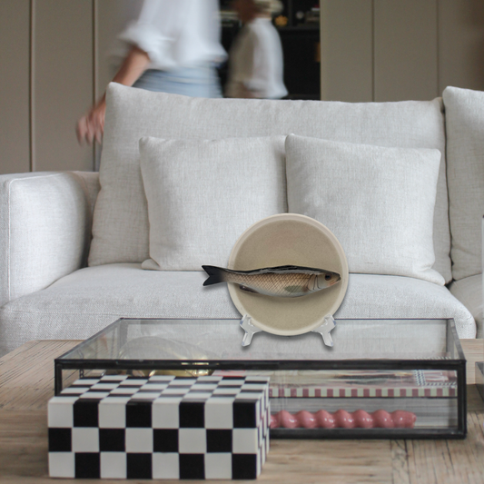 Spigola medio op zandkleurig bord met lichte rand, 15 cm