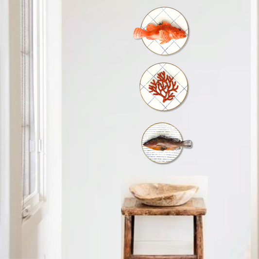 Koraal piccolo met sardientje op wit bord met blauwe verfspetters, 21 cm rond.