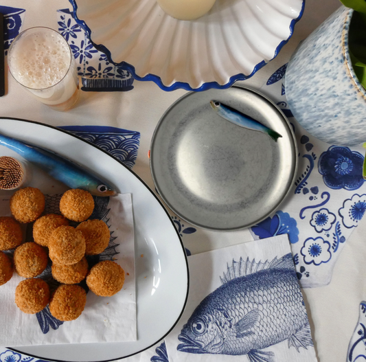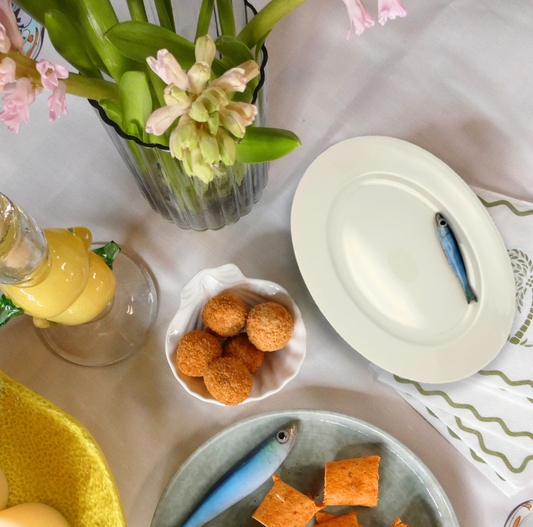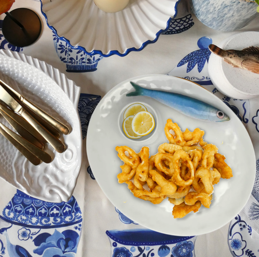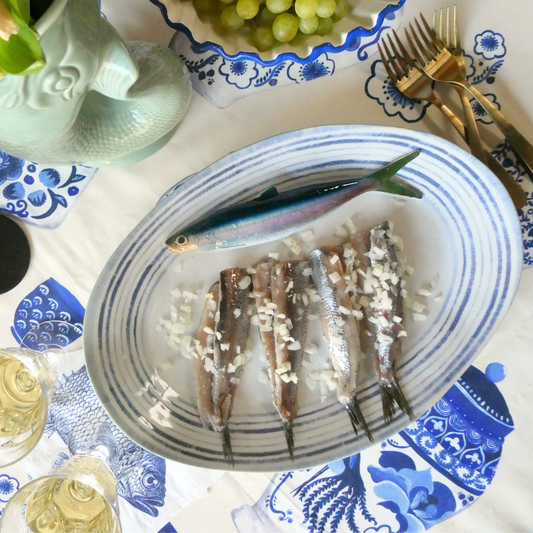 Haring/Alaccia op een groot ovaal serveerbord met blauw gestreepte rand.