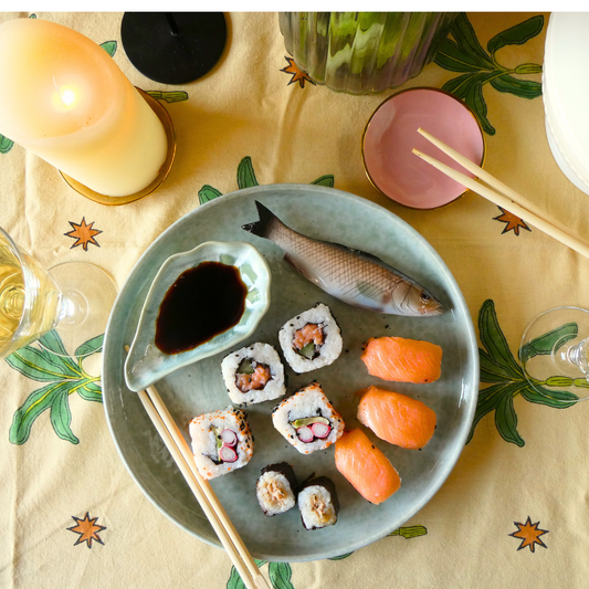Spigola medio op een zeegroen borrelbord incl. dipschaaltje 26 cm