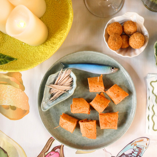 Sardine op een zeegroen borrelbord incl. dipschaaltje. 26 cm