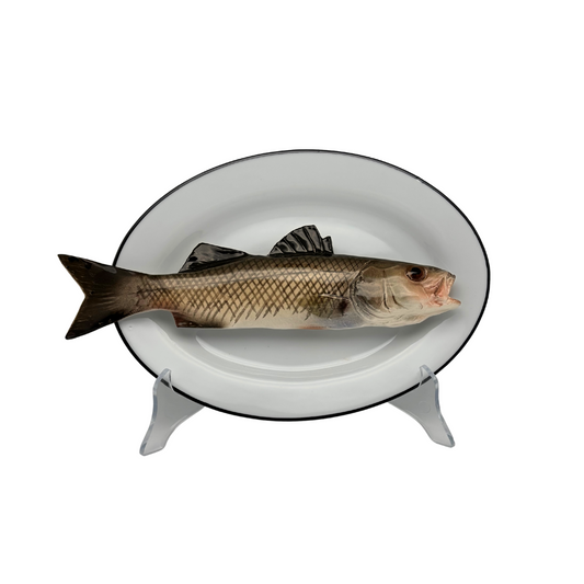 Spigola op ovaal wit bord met donker grijze rand, 25x17cm