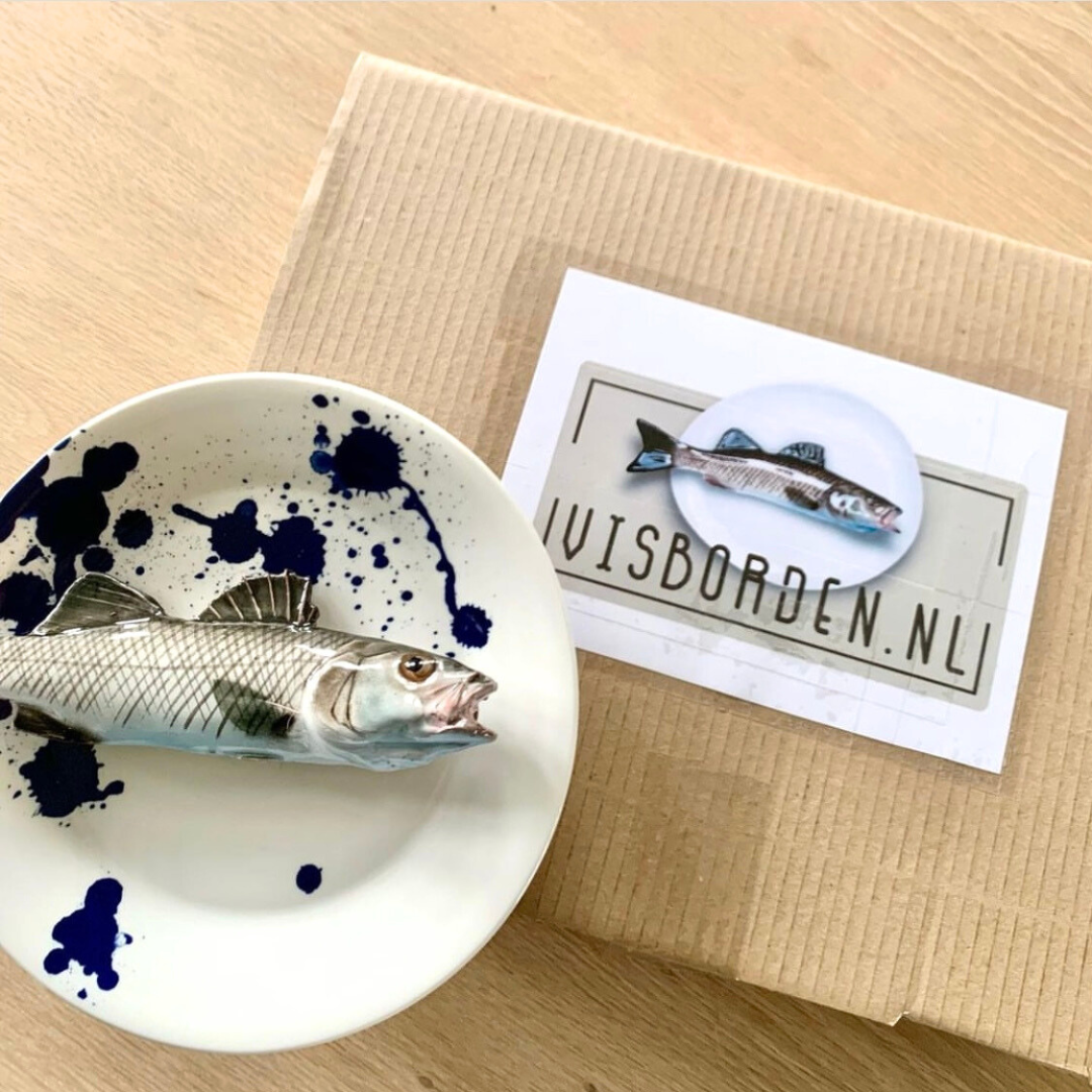 De combinaties van de vissen op de borden worden in ons atelier gemaakt. Bij elke vis zoeken we een passend bord qua formaat en kleur. Wij laten de staartjes van de vissen bewust over de rand uitsteken, omdat de vis dan als een object op het bord ligt en het niet lijkt alsof het erop geschilderd is. Het verpakken is daardoor wel een uitdaging geworden, maar na veel zoeken en testen hebben we de 'breukvrije' verpakking gevonden.