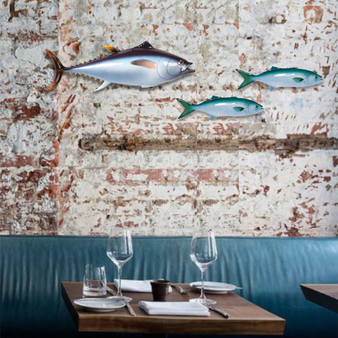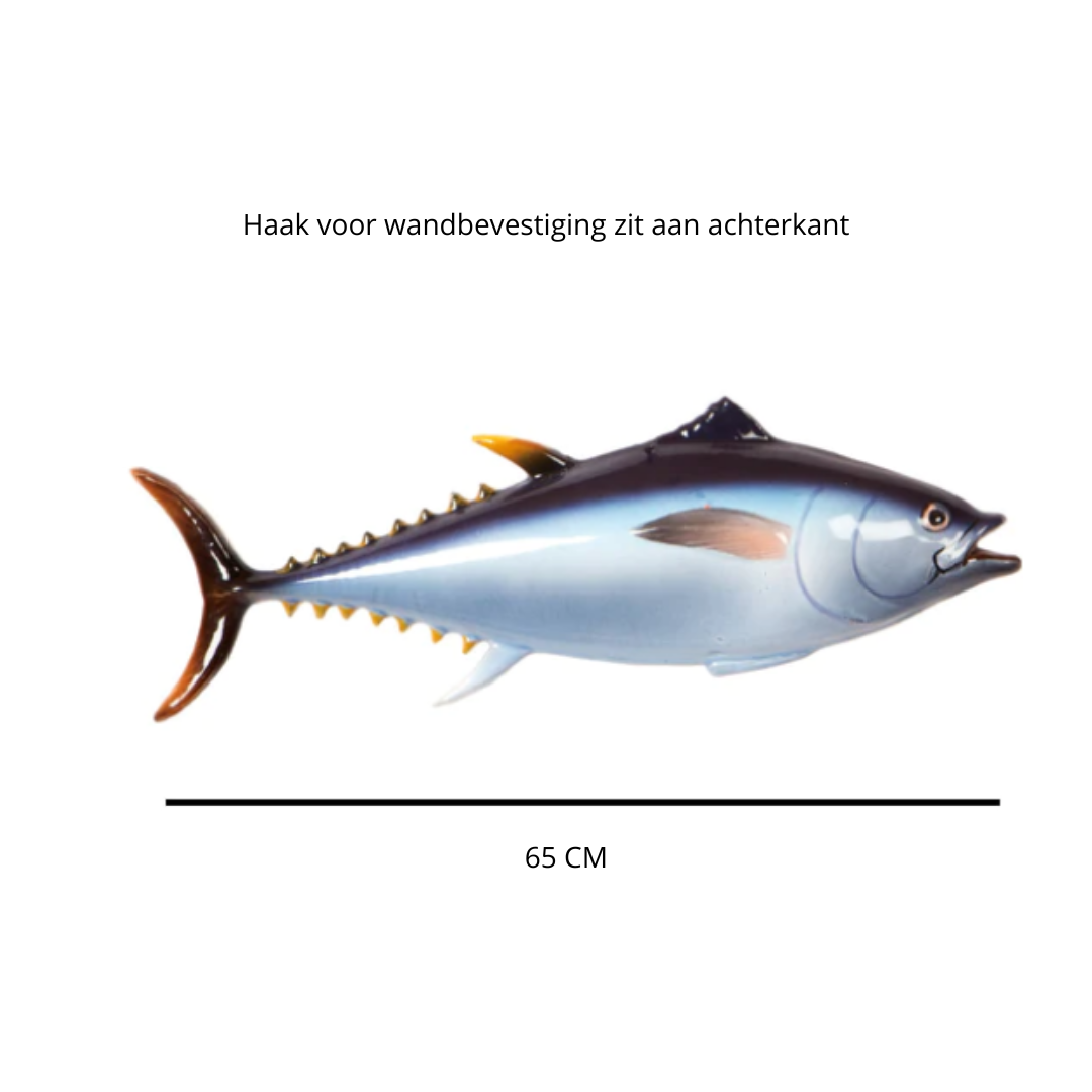 Deze Tonijn van 65 cm is een echte Eye-catcher aan de wand! Deze "baas" hangt ook super leuk tussen andere losse vissen. Ook deze vis is handgemaakt en van keramiek. Er zit een ophanghaakje aan de achterkant, zodat je jouw vangst direct aan de wand kunt hangen.