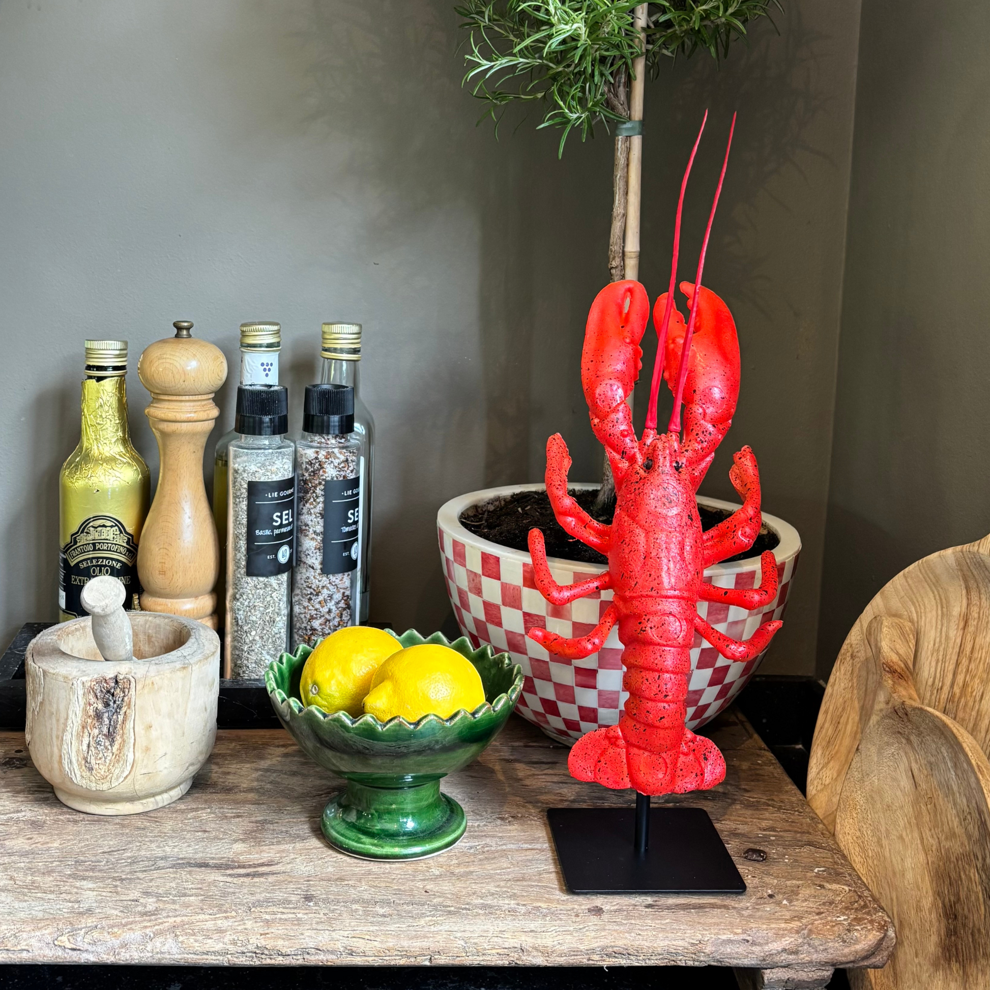 Kunst Kreeft gemaakt van polymeer ongeveer 43 cm hoog, bevestigd op een solide zwart stalen standaard met vierkante voet (9X9cm). Dit object staat heel decoratief in de keuken, onder een grote stolp wordt het helemaal een kunstobject! Geef dit cadeau aan een kookliefhebber, te leuk!