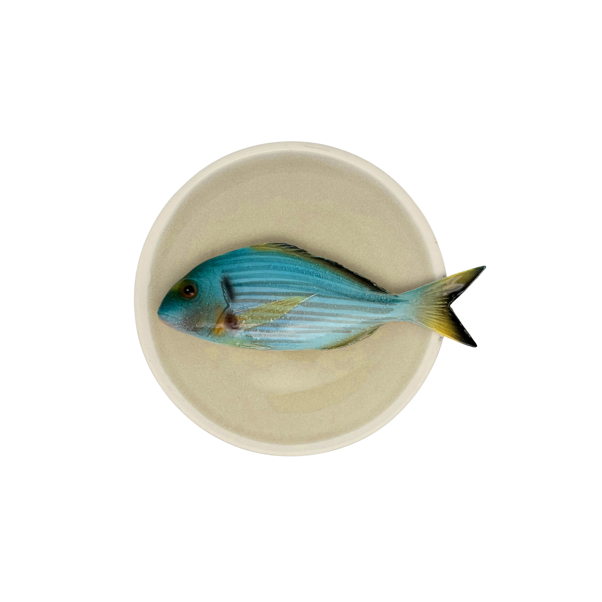 1103 Orata medio op een zandkleur bord, 20cm rond