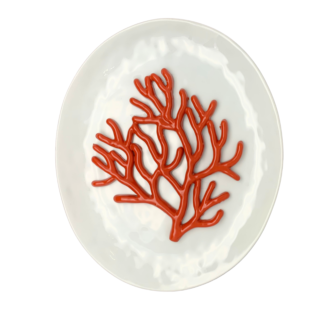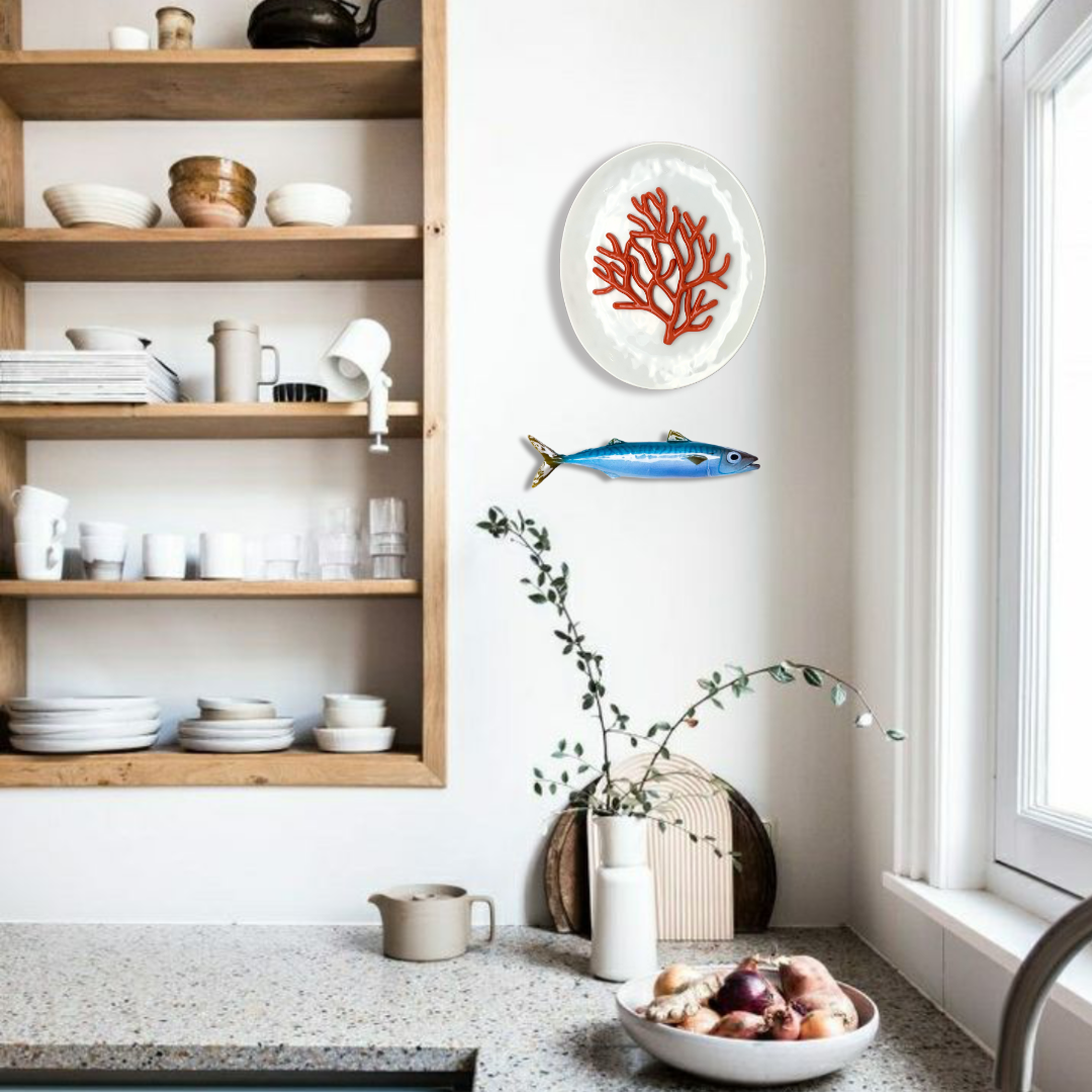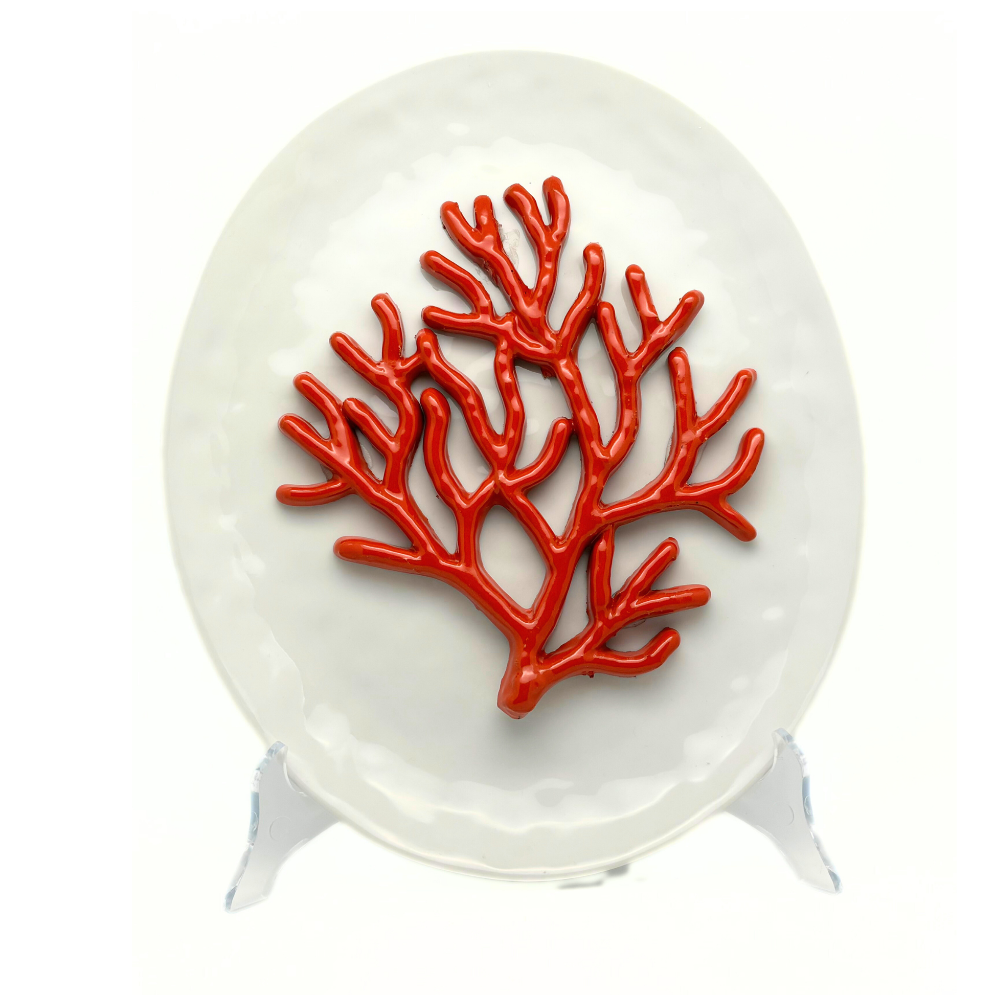 Keramiek Koraal medio op een wit ovaal bord 27X19cm, heel decoratief voor aan de wand of op een bordenstandaard in de kast. Inclusief ophanghaakje aan de achterkant en kan direct aan de wand gehangen worden.