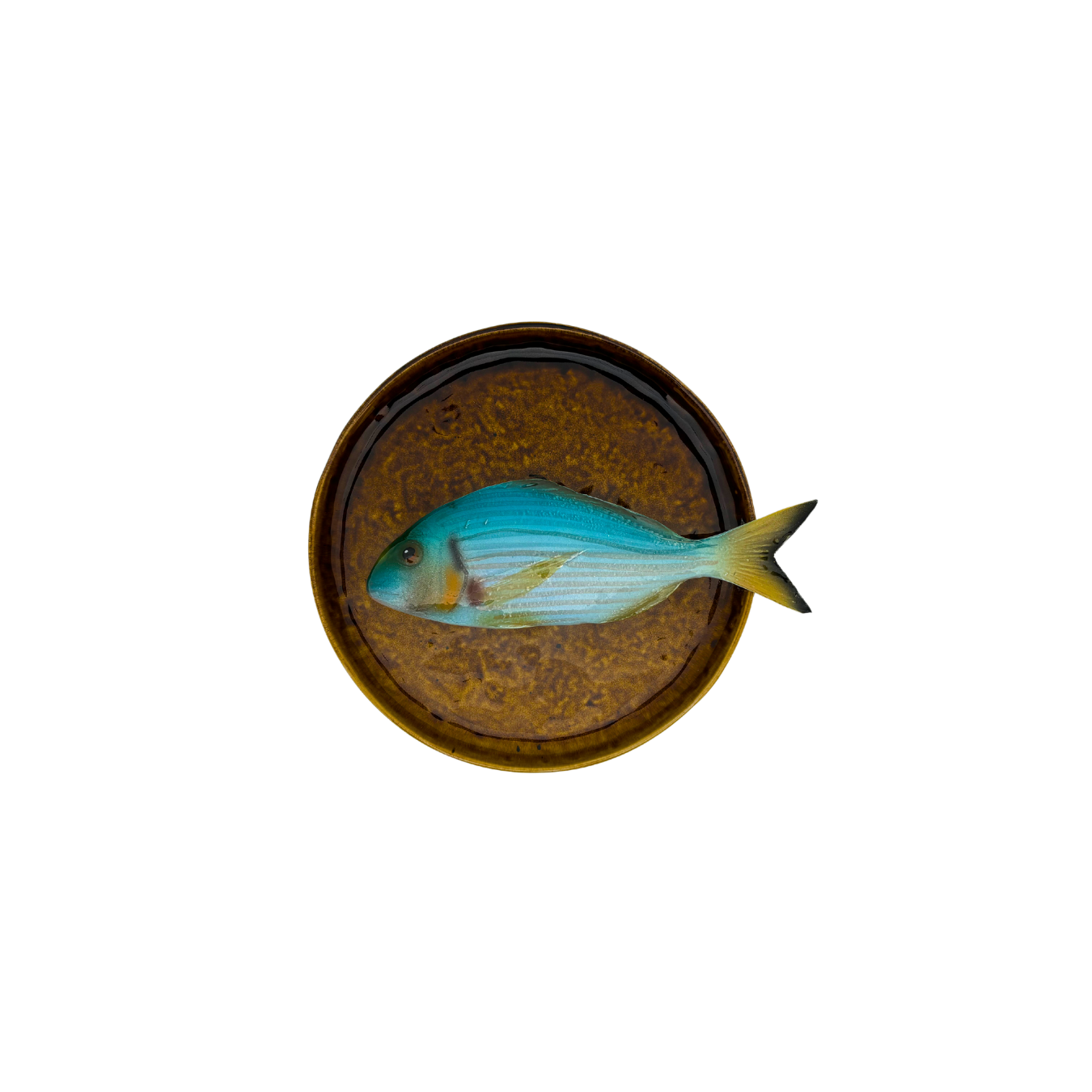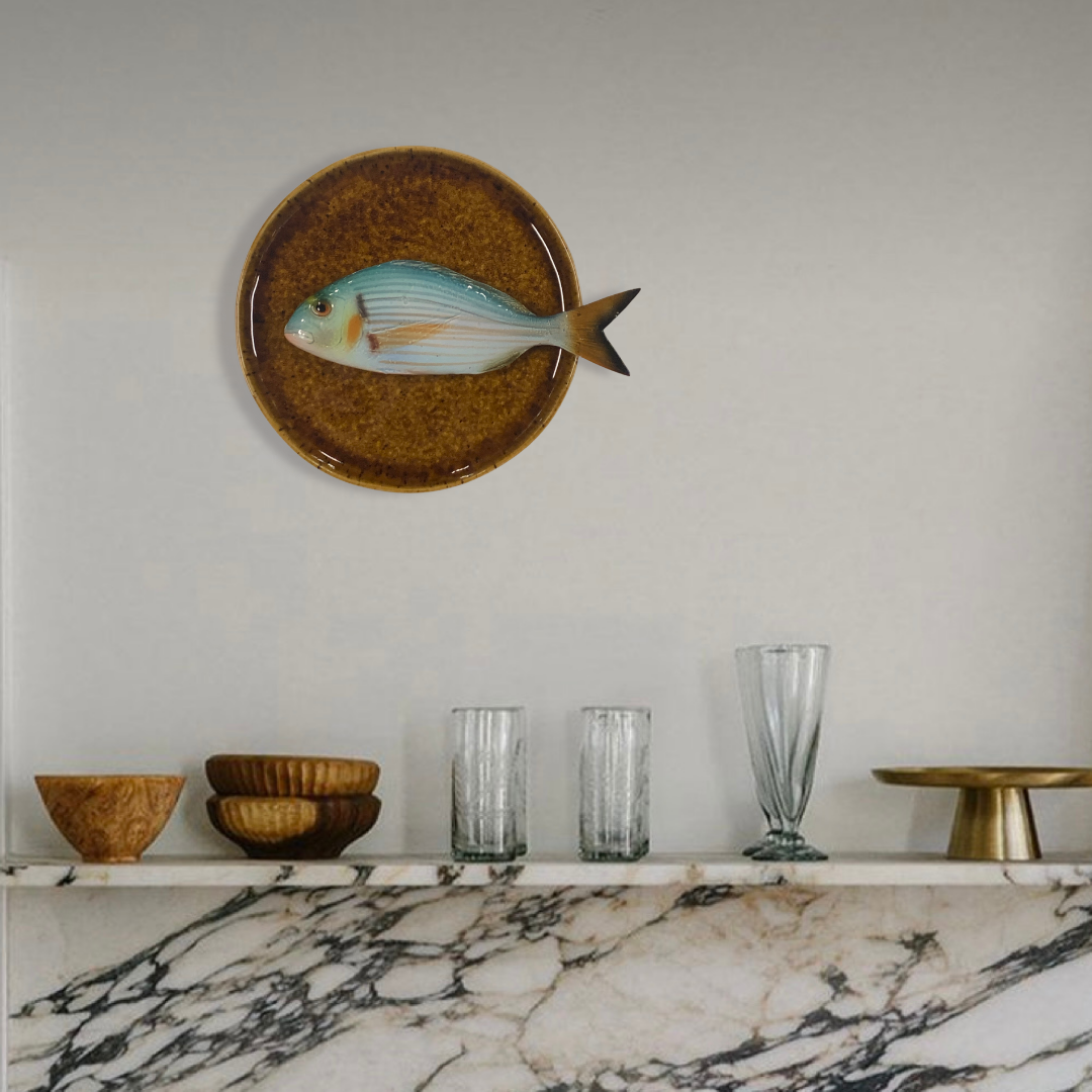 Orata medio op een donker bruin bord van 21 cm rond. inclusief ophangsysteem aan de achterkant en kan direct aan de wand gehangen geworden.