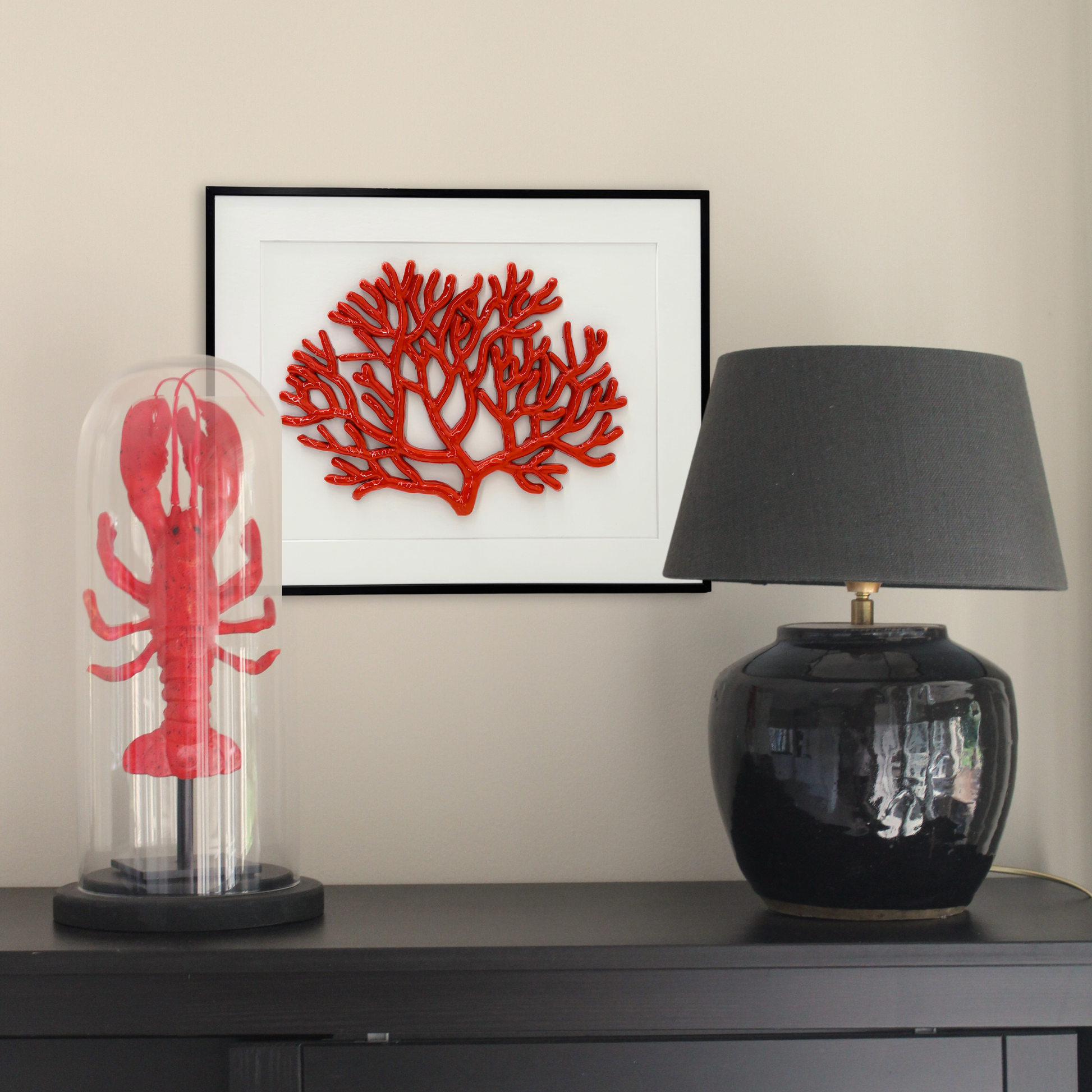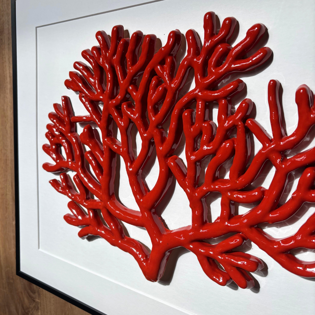 Groot Koraal van keramiek , ingelijst met een off-white kleur passe-partout. De afmeting van de lijst is 50x40cm in zwart metaal. Er zit geen glas voor de lijst.
