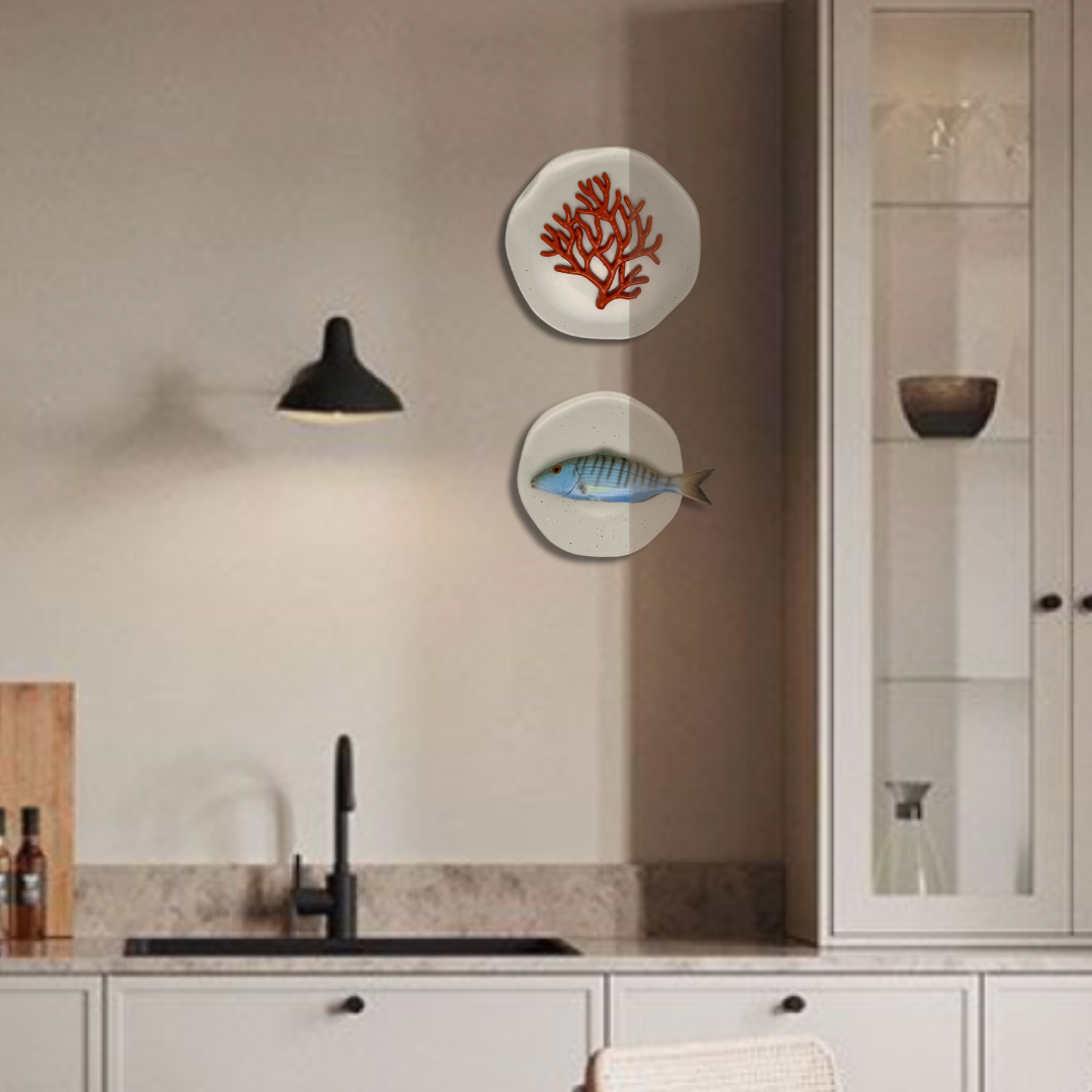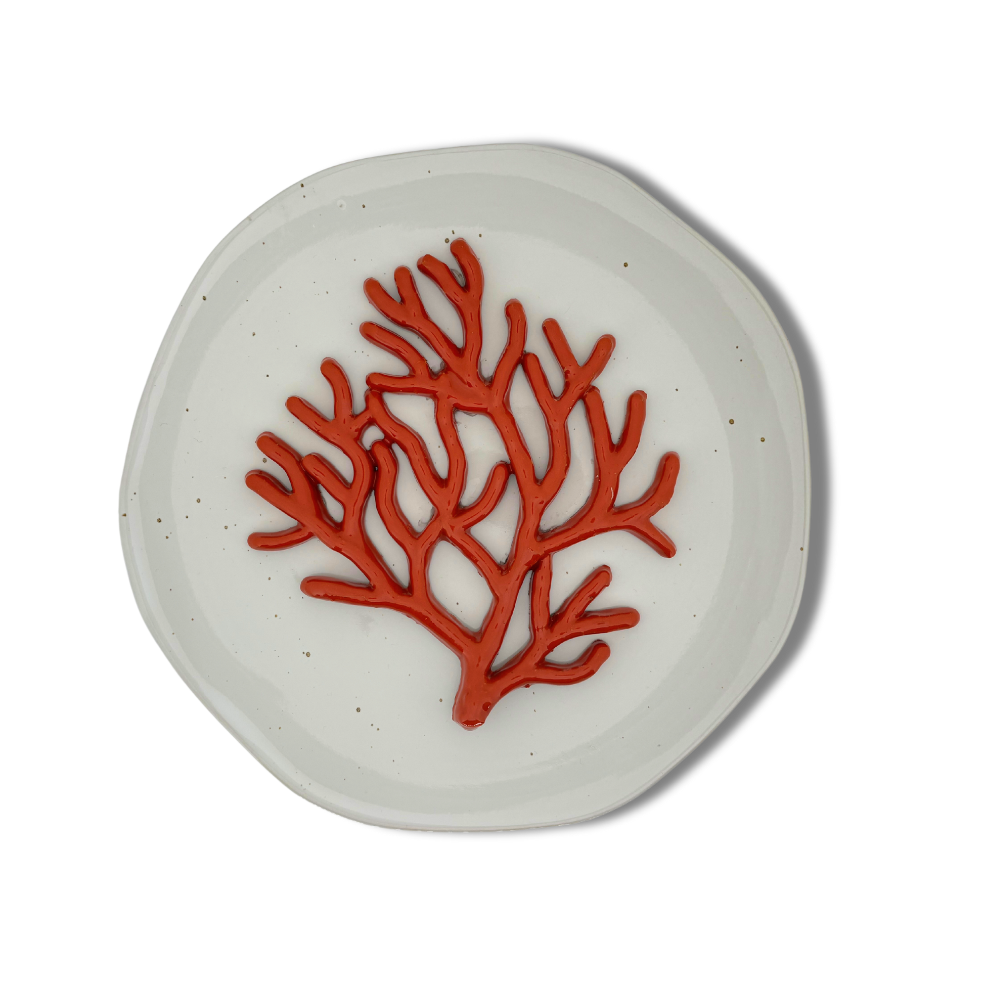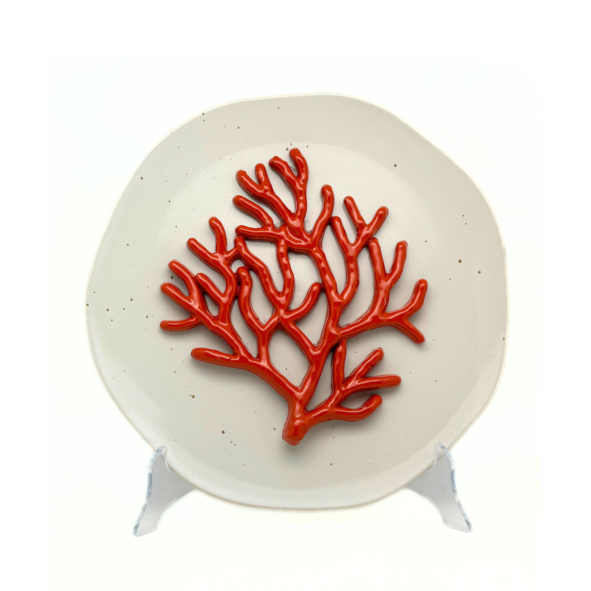 Koraal medio op kiezel/grijs hoekig bord, 26 cm. Aan de achterkant is een ophanghaak bevestigd en kan direct aan de wand gehangen worden.