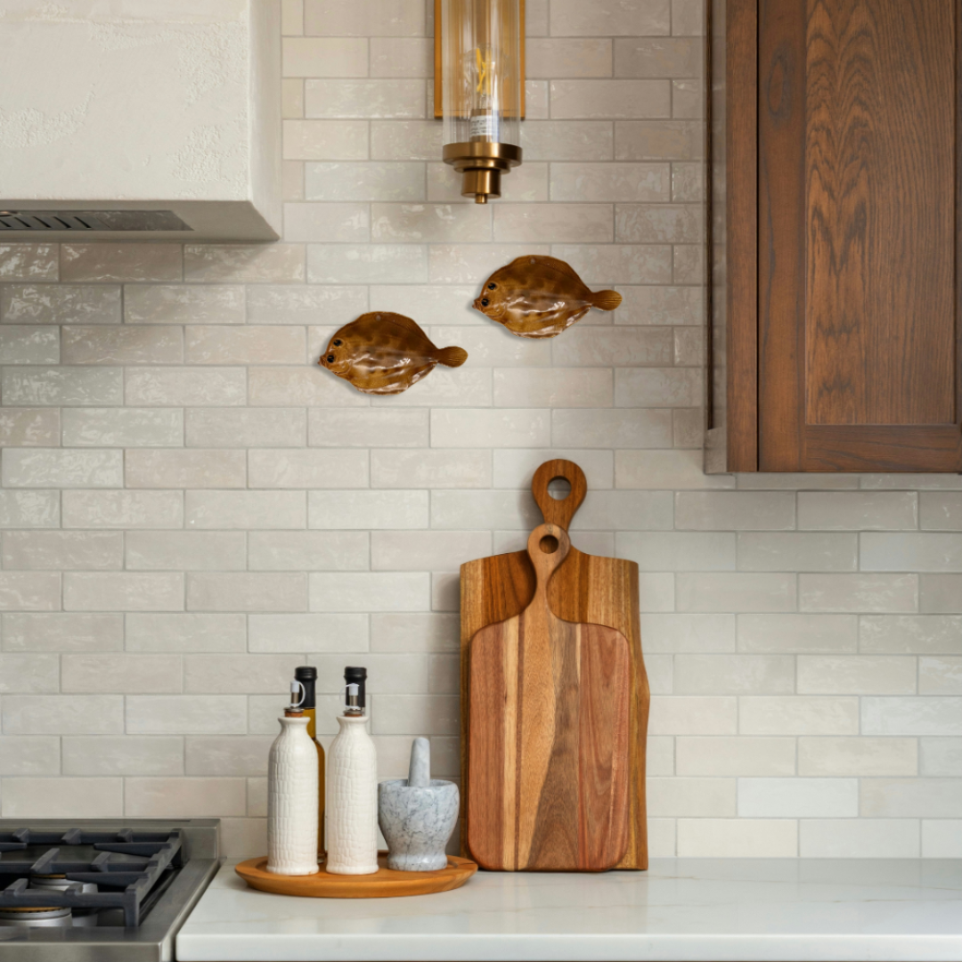 Pettine, kleine schol/platvis bruin gevlekt, 16 cm. Er zit al een klein gaatje in de vis, en kan direct aan de wand gehangen worden, maar ook decoratief op een stapel kookboeken of als messenlegger op een gedekte tafel gebruikt worden.