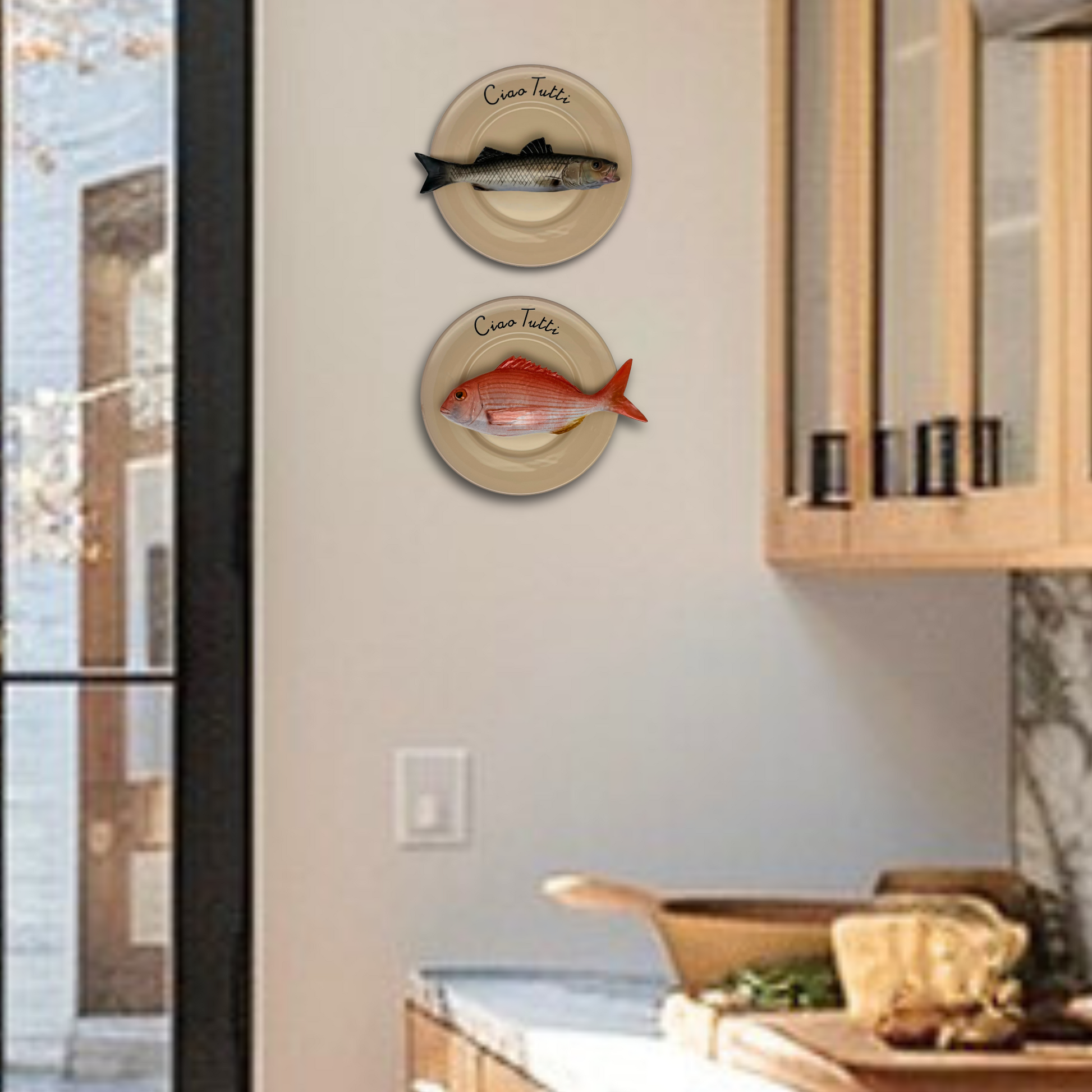 Spigola op camel/zand kleur bord "Ciao Tutti", 23 cm rond Aan de achterkant zit een ophanghaakje bevestigd en kan direct aan de wand gehangen worden.