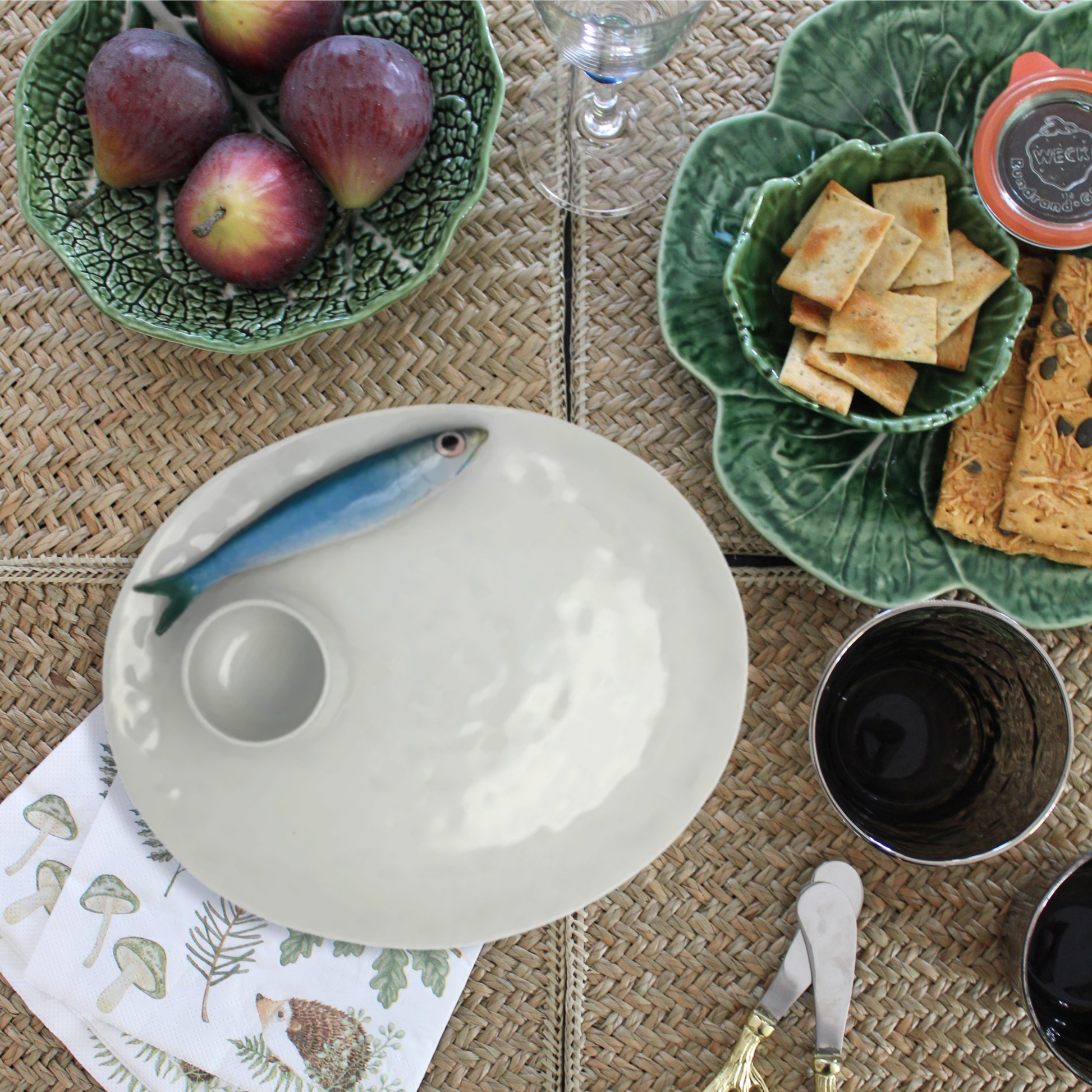 Een uniek serveer/borrelbord wit met sardine en dipbakje, 28x24 cm ovale vorm. Het visje en het bakje zitten vast op het bord. Origineel om je toastjes met zalm/haring of om je Sushi op te serveren! Super mooi om cadeau te geven..