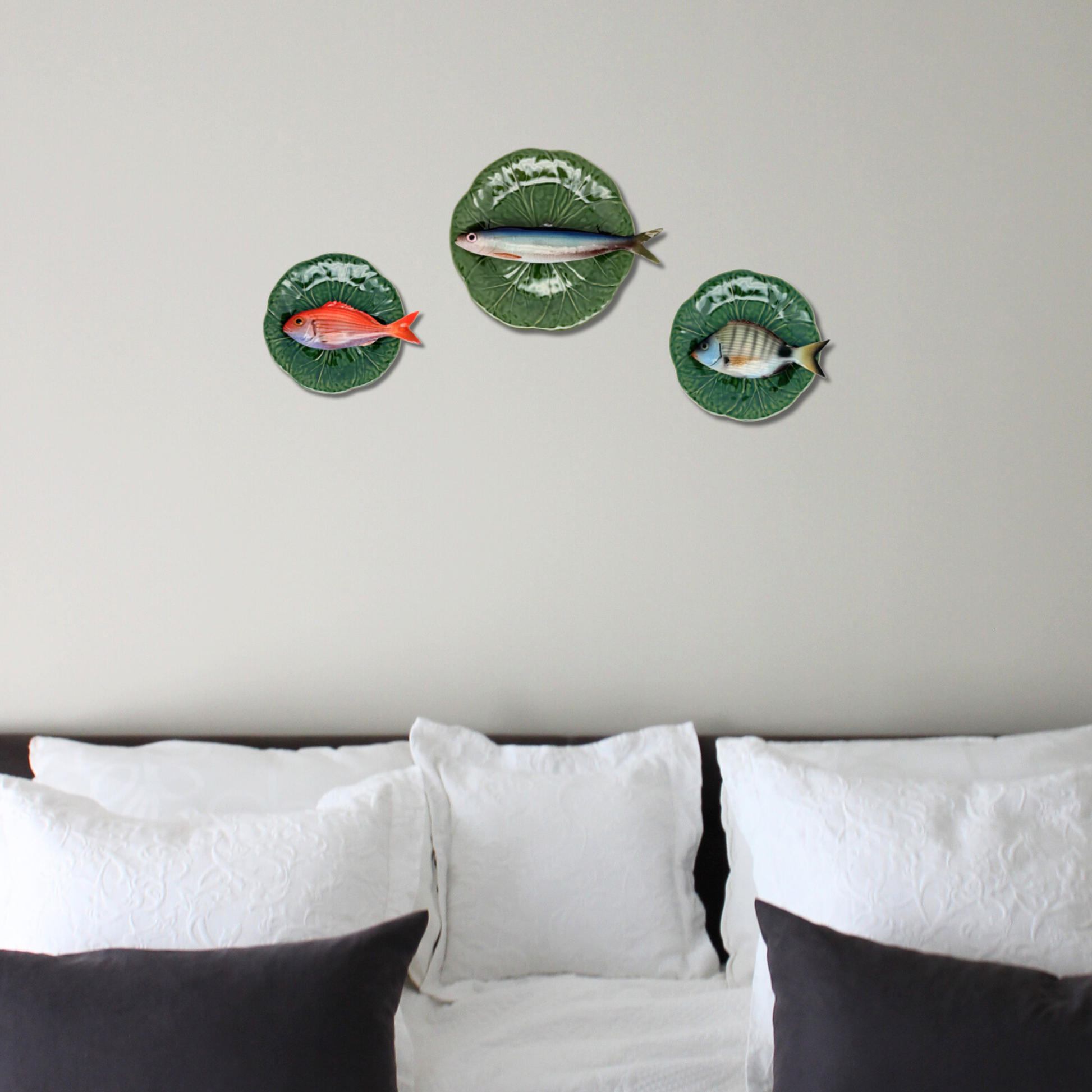 Alaccia/Haring op een groen bladvormig bord, 27cm met aan de achterkant een ophanghaakje bevestigd en kan direct aan de wand gehangen worden.