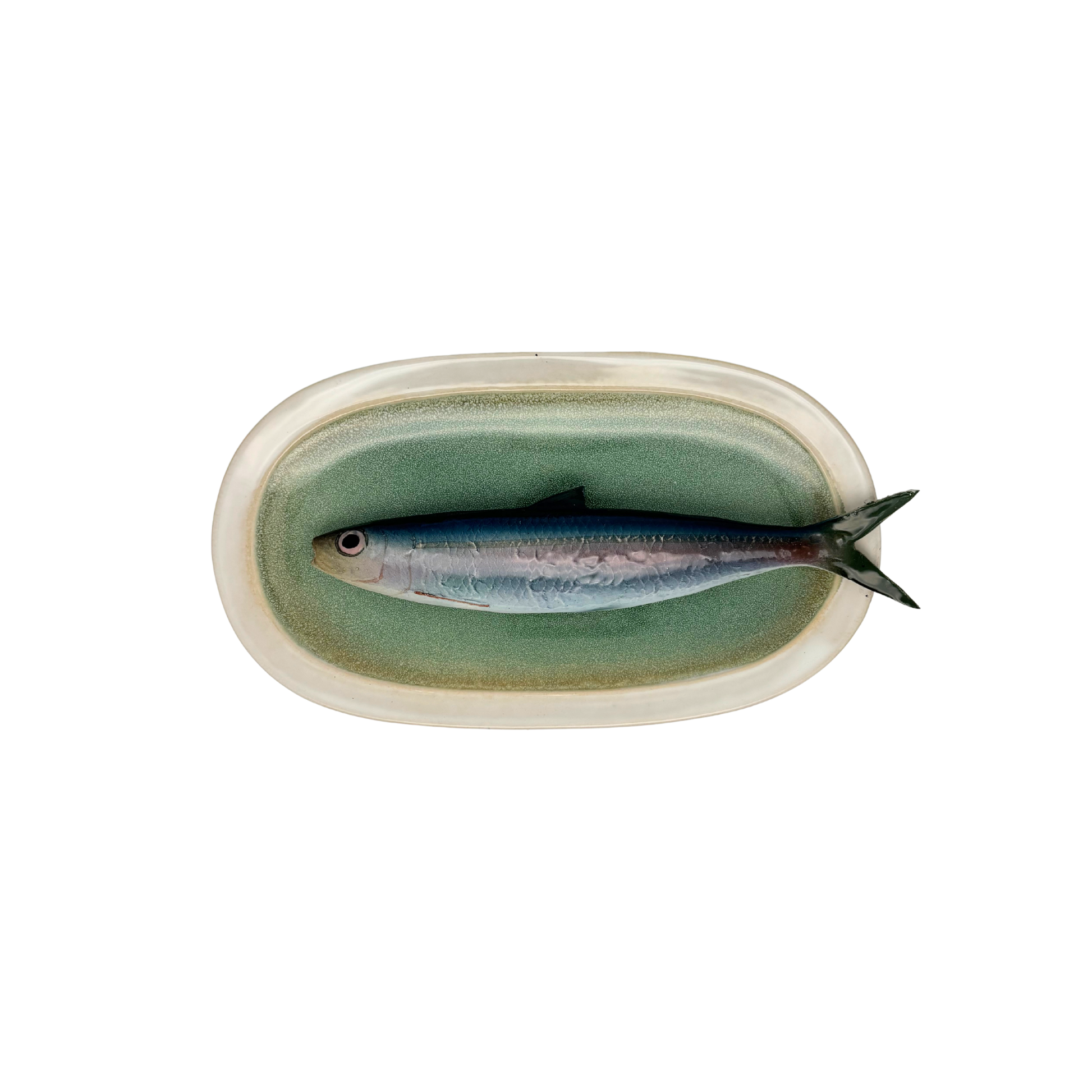 Alaccia/Haring op ovaal groen bord met lichte rand, 26x25cm