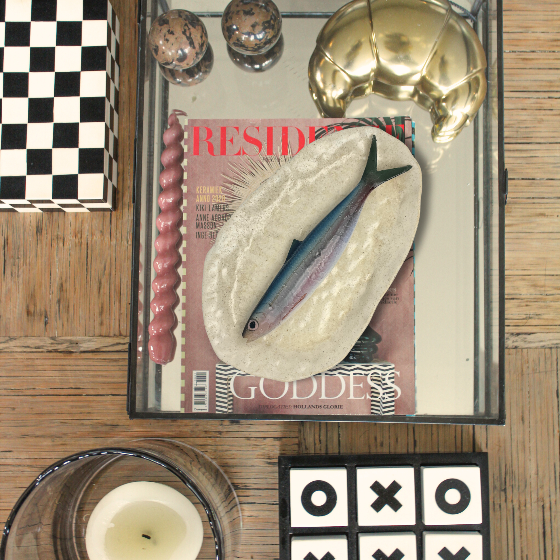 Alaccia op rustiek, organisch gevormd zandbeige bord, 27.5X17cm