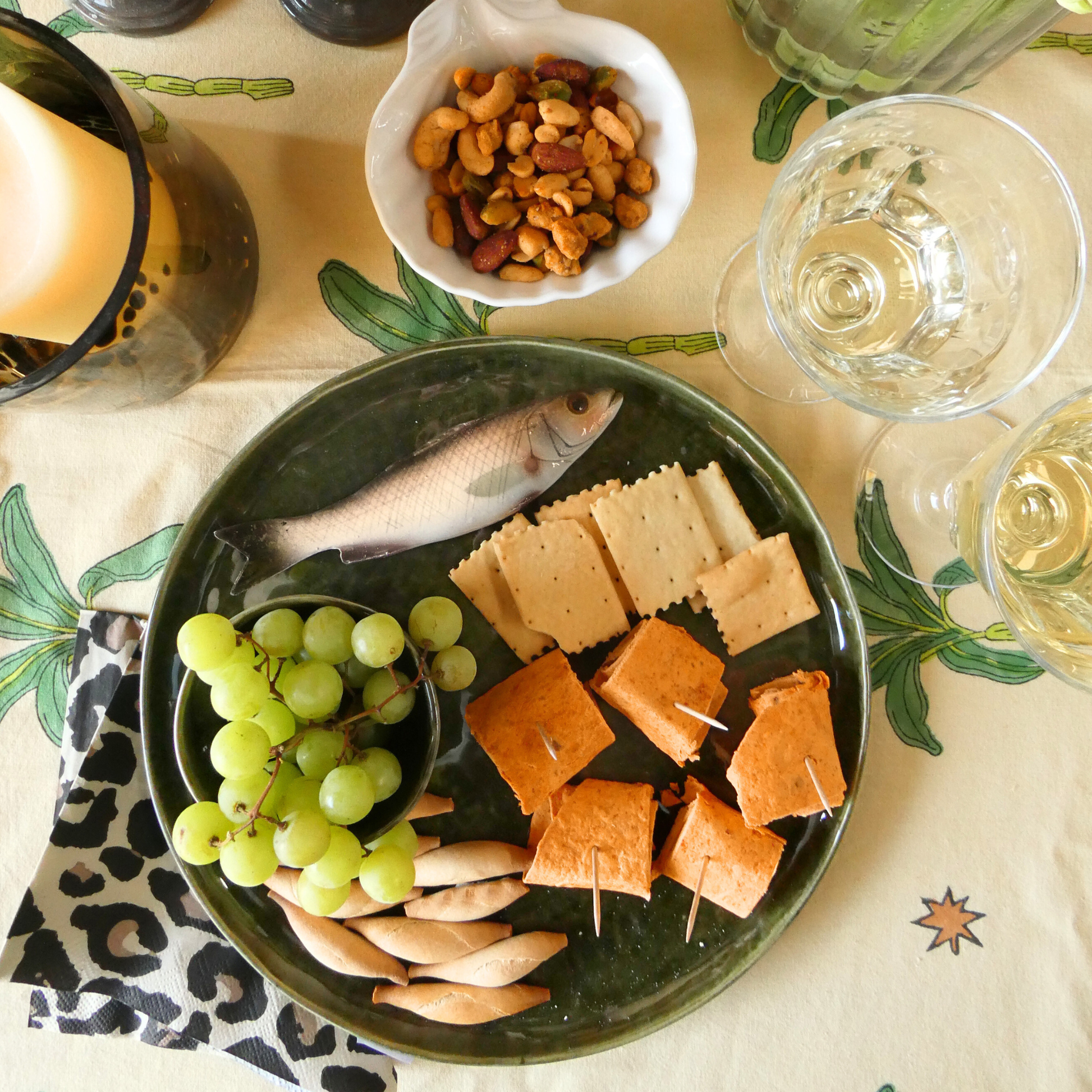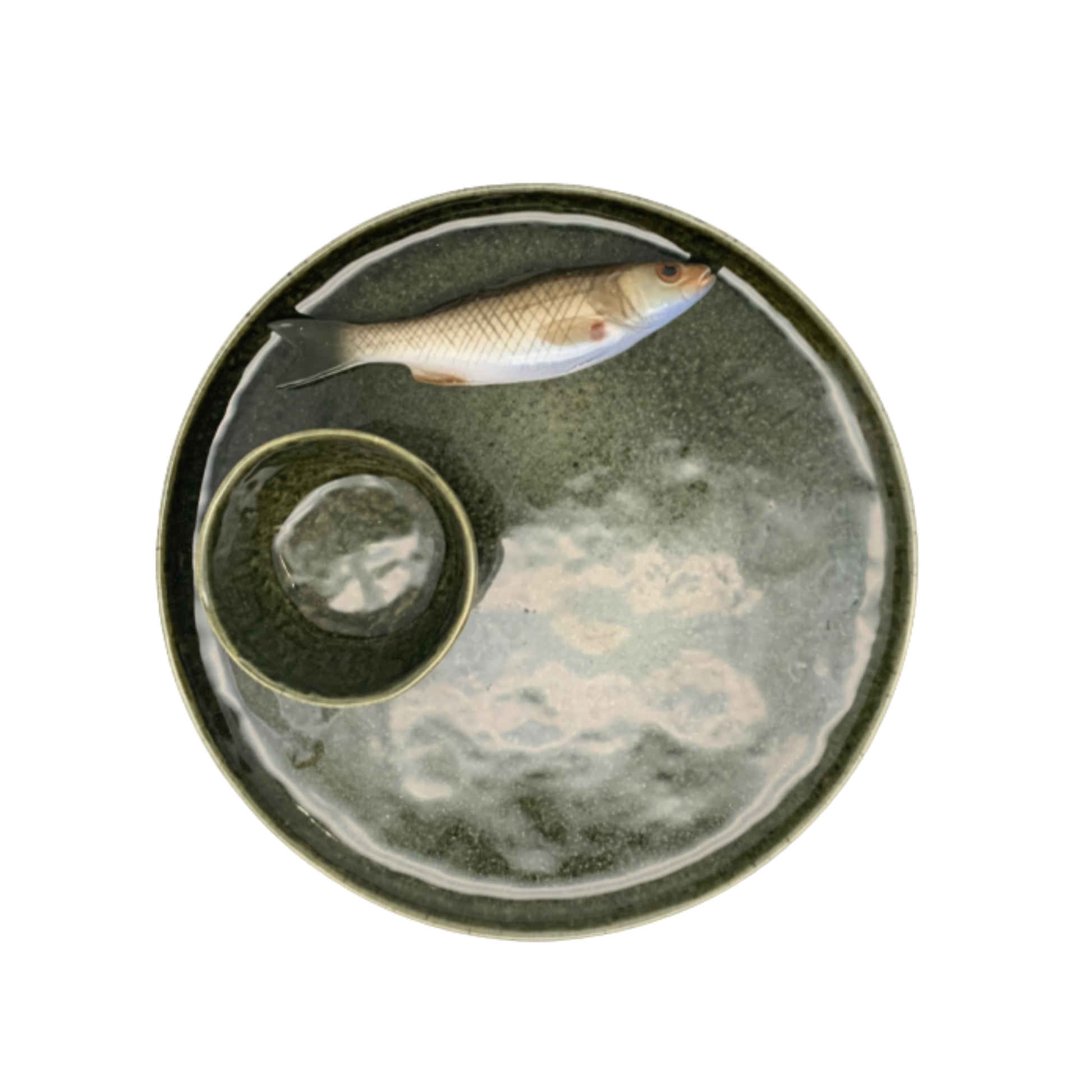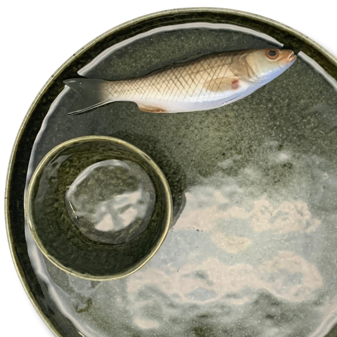 Een speels borrelbord met de Spigola medio en een dipschaaltje die subtiel op het bord zijn bevestigd. Het bord is donker groen gemêleerd en is te gebruiken om hapjes op te serveren zoals, bittergarnituur, vishapjes enz.