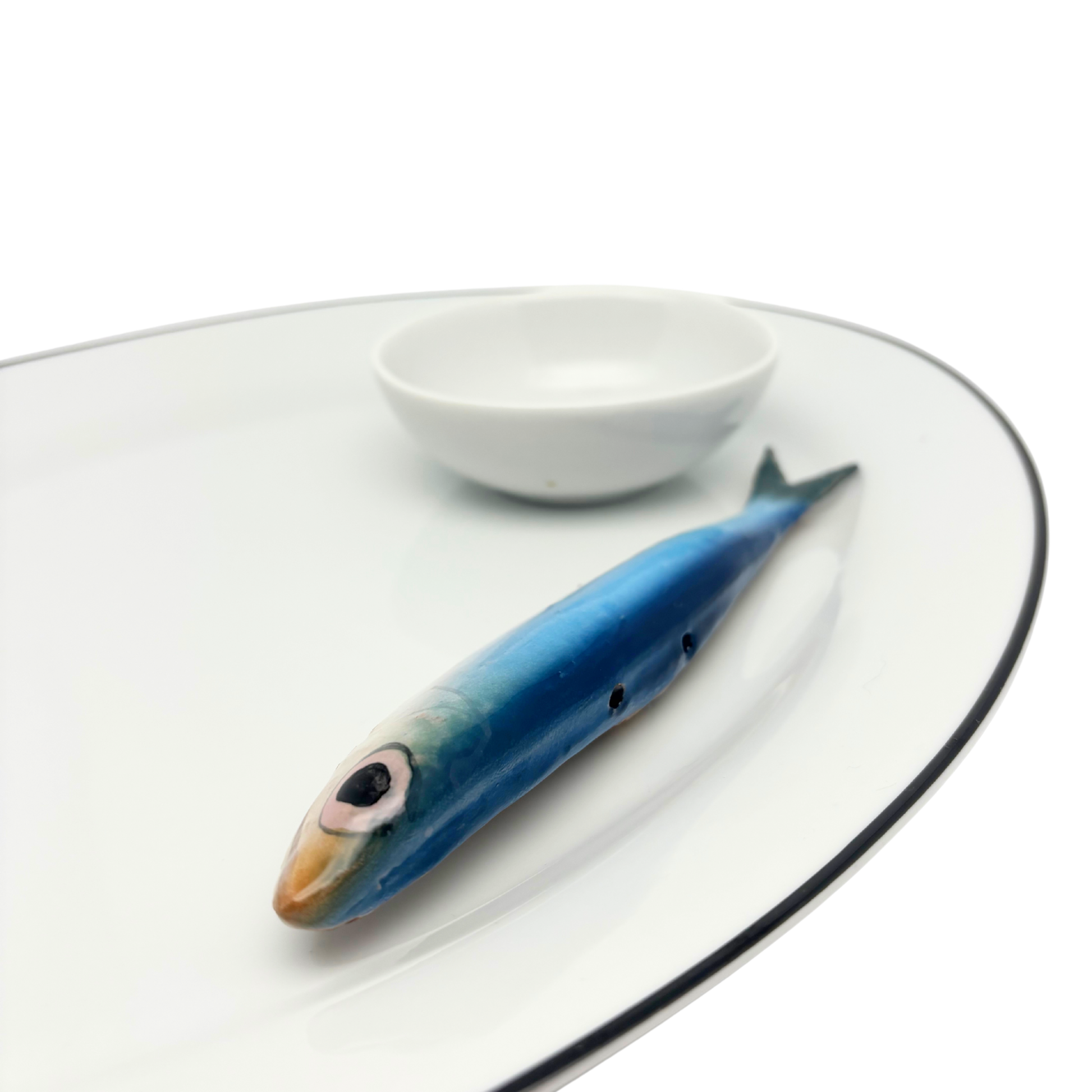 Een stijlvol ovaal borrelbord met de Alaccia/Haring en een ovaal dipschaaltje. Het witte bord met donker grijze rand geeft een frisse, maritieme uitstraling en maakt dit serveerbord een echte blikvanger op tafel.