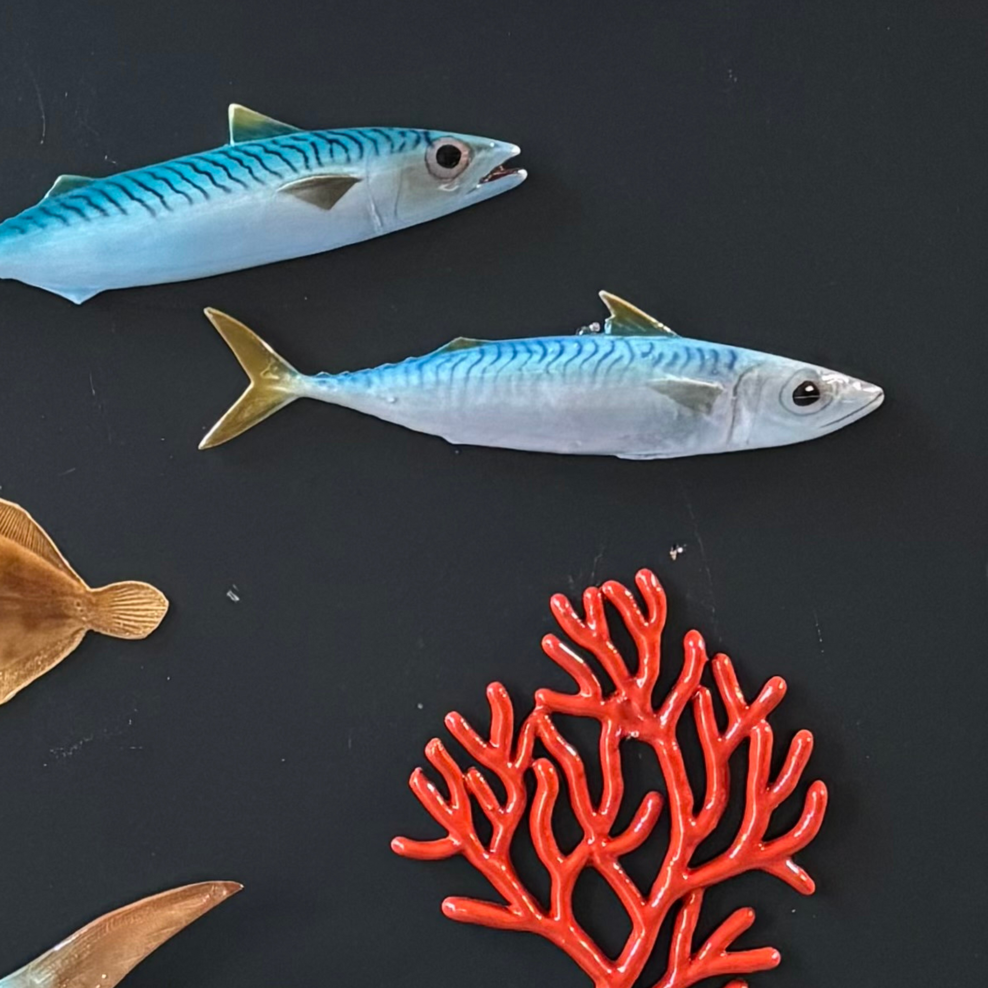 Makreel/Tombarello is 28cm lang en heeft een ophanghaakje meegebakken aan de achterkant en kan direct aan de wand gehangen worden.