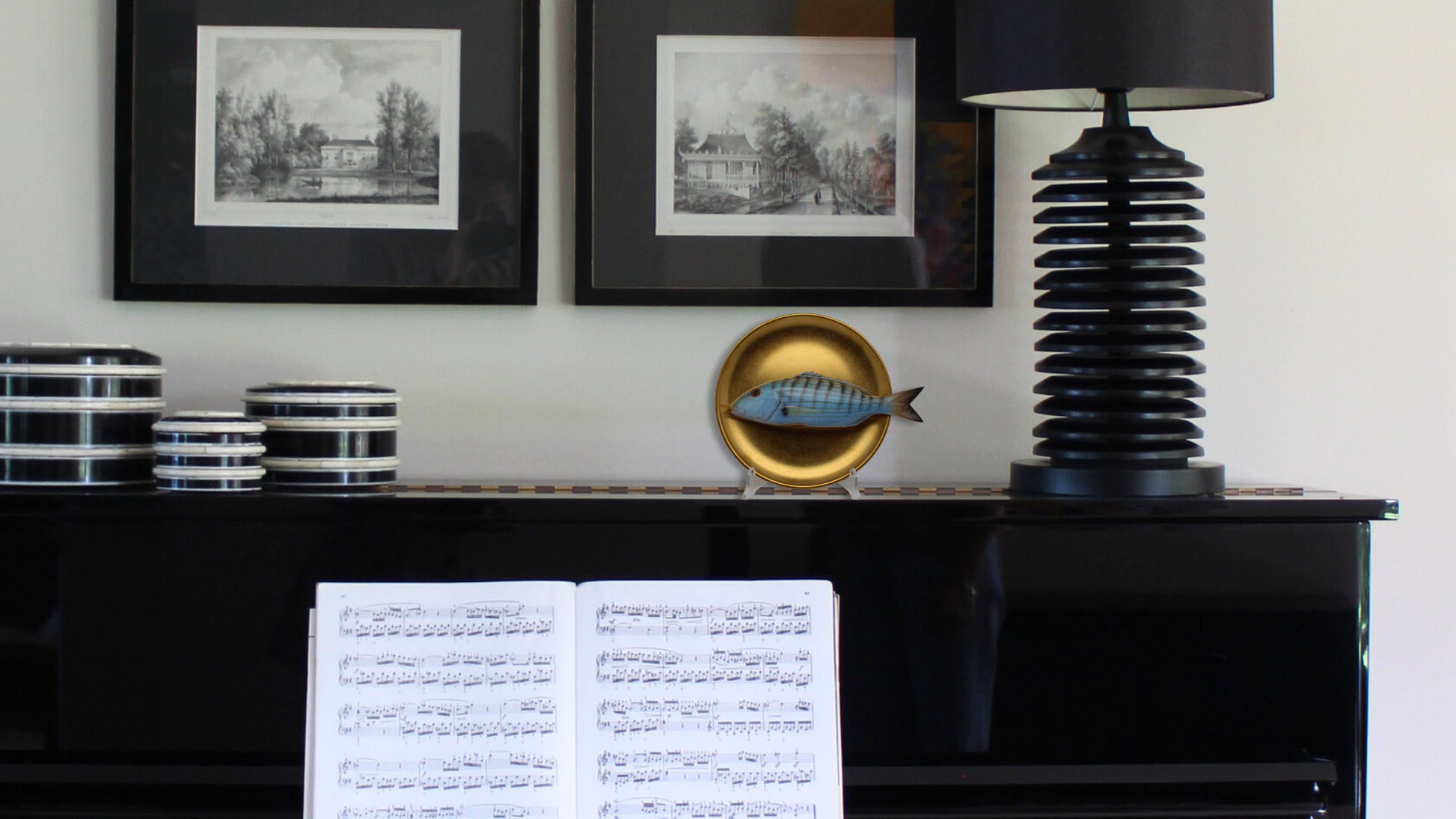 Marmora op antiek gouden bord, 20 cm rond, aan de achterkant zit een ophanghaakje bevestigd en kan direct aan de wand gehangen worden.