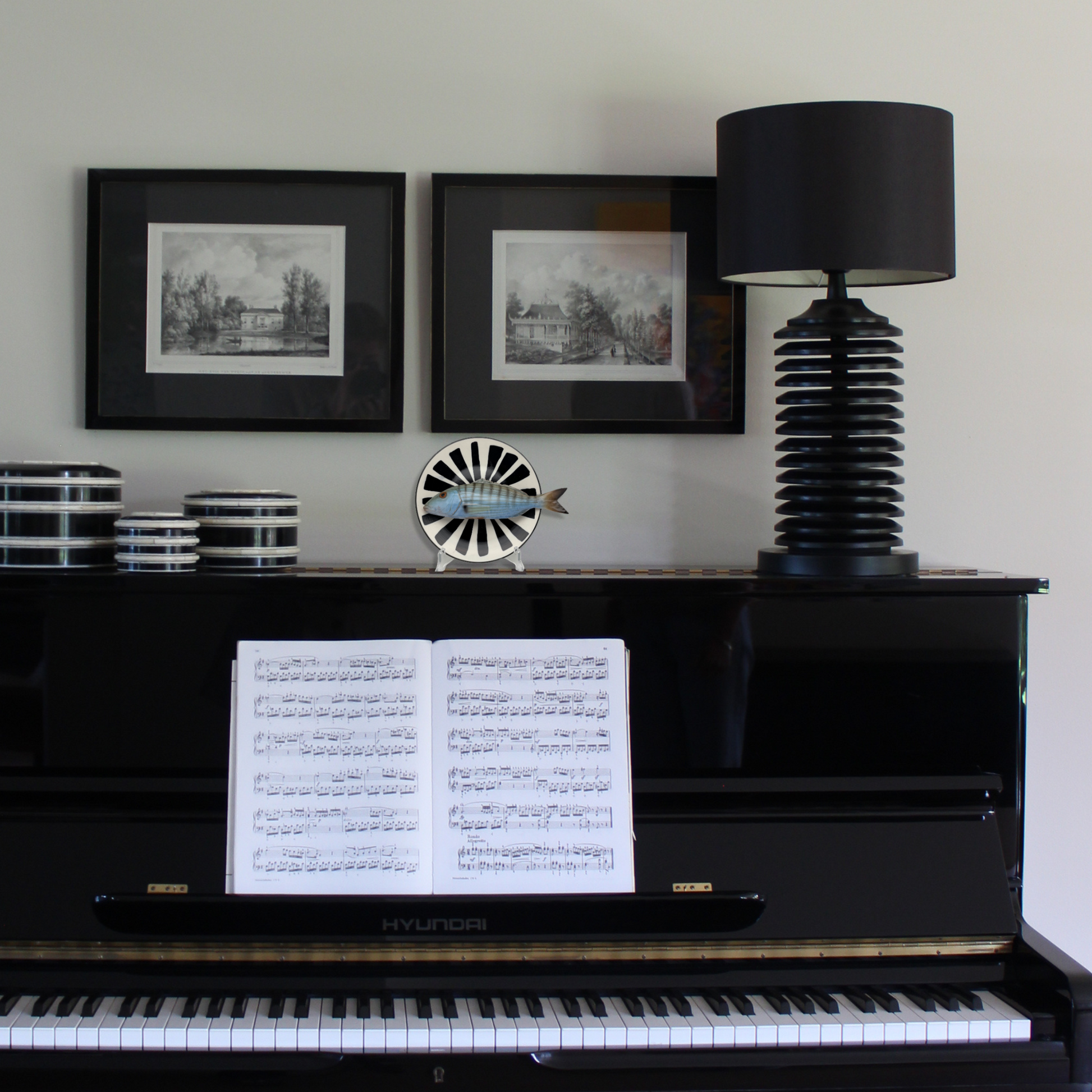 Marmora op zwart met wit bewerkt bord, 20 cm. Aan de achterkant zit een ophanghaakje bevestigd en kan direct aan de wand gehangen worden.