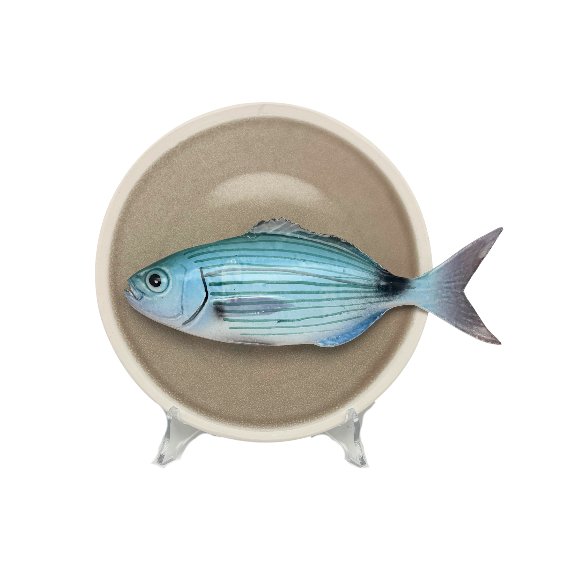 Occhiata op zandkleur bord met lichte rand, 20cm rond. Aan de achterkant is een ophanghaakje bevestigd en kan direct aan de wand gehangen worden.