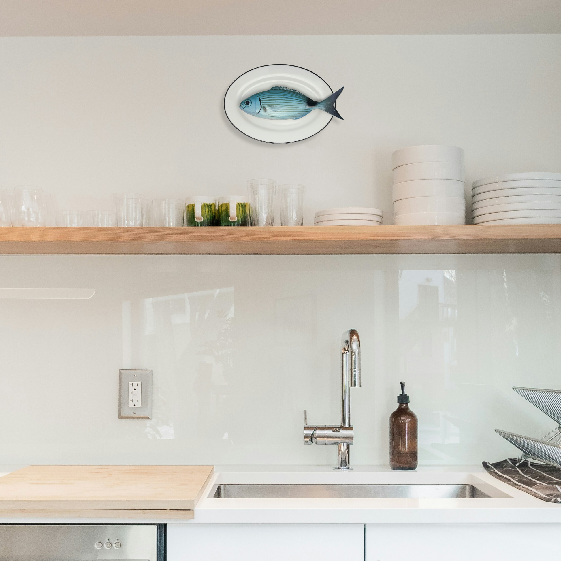 Occhiata op een wit ovaal bord met donker grijze rand, 24x17cm. Aan de achterkant zit een ophanghaakje bevestigd en kan direct aan de wand gehangen worden.