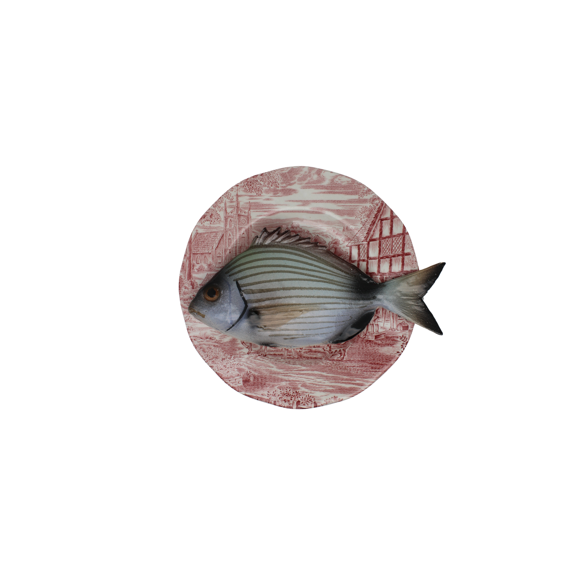 Sarago medio op een Engels vintage roze bord, 16 cm rond. Aan de achterkant is een ophanghaakje bevestigd en kan direct aan de wand gehangen worden.