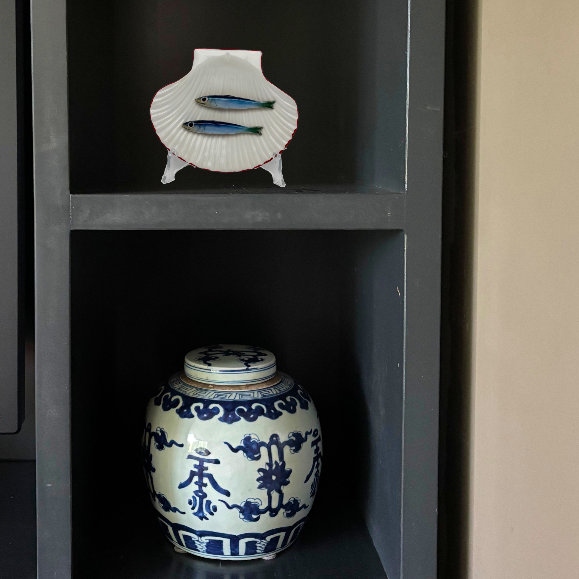 Sardines op een schelpen bordje met rode rand, 13X16cm