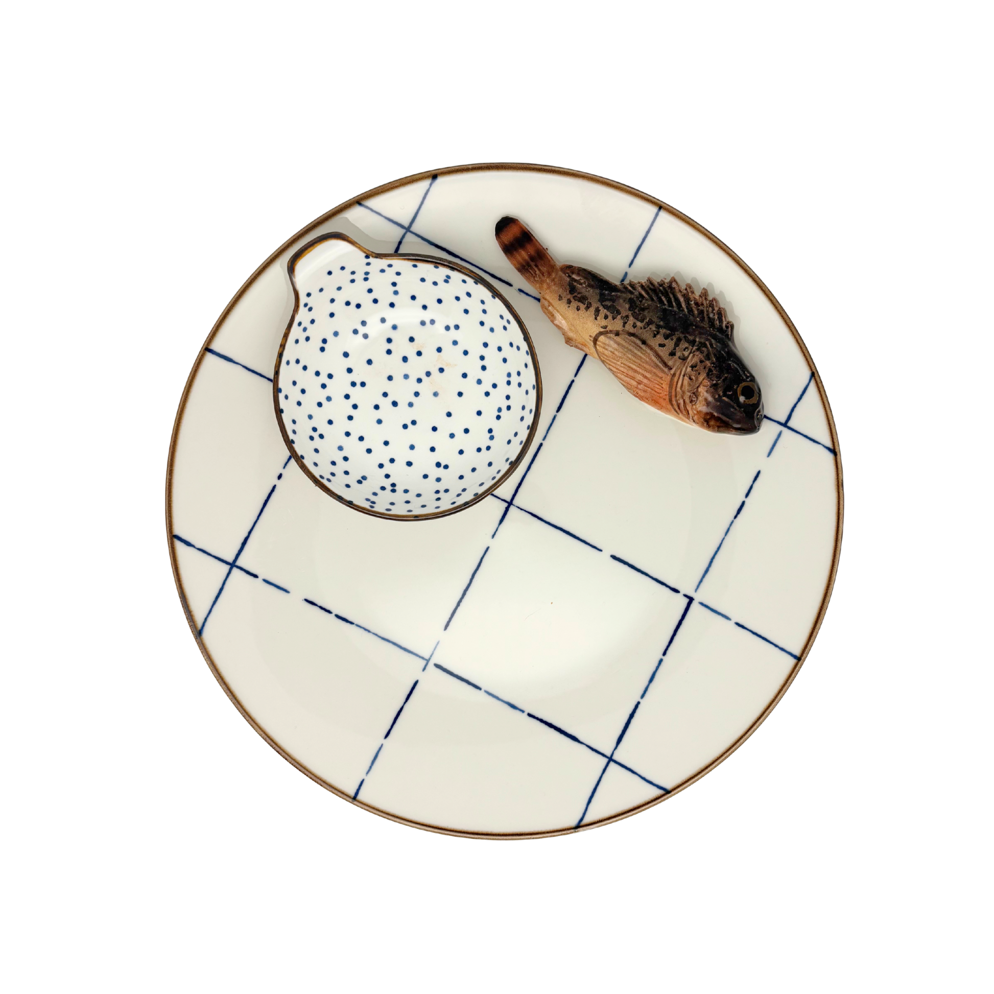 Een speels borrelbord met de Scorfano Marrone en een dipschaaltje die subtiel op het bord zijn bevestigd. Het lichte bord met subtiel blauw ruitpatroon en dipbakje met kleine stippen geven een frisse, maritieme uitstraling en maakt dit serviesstuk een echte blikvanger op tafel.
