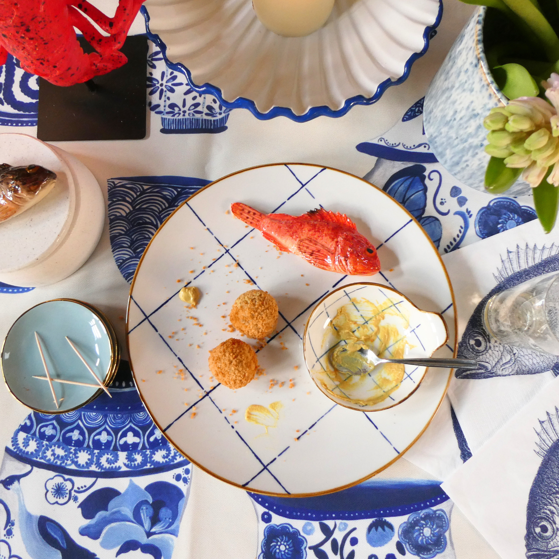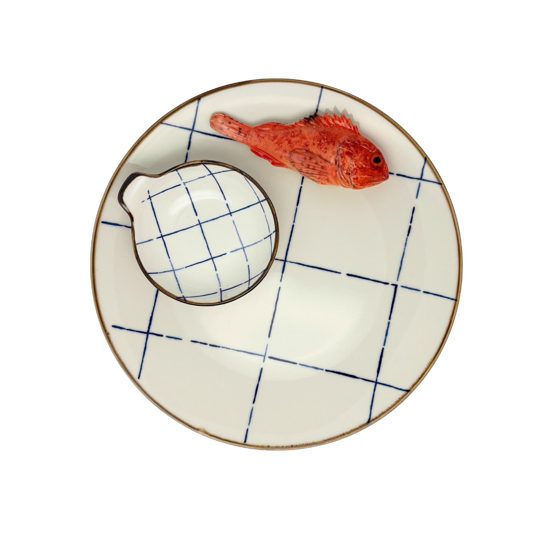 Een speels borrelbord met de Scorfano en een bijpassend dipschaaltje die subtiel op het bord zijn bevestigd. Het lichte bord met subtiel blauw ruitpatroon geeft een frisse, maritieme uitstraling en maakt dit serviesstuk een echte blikvanger op tafel.