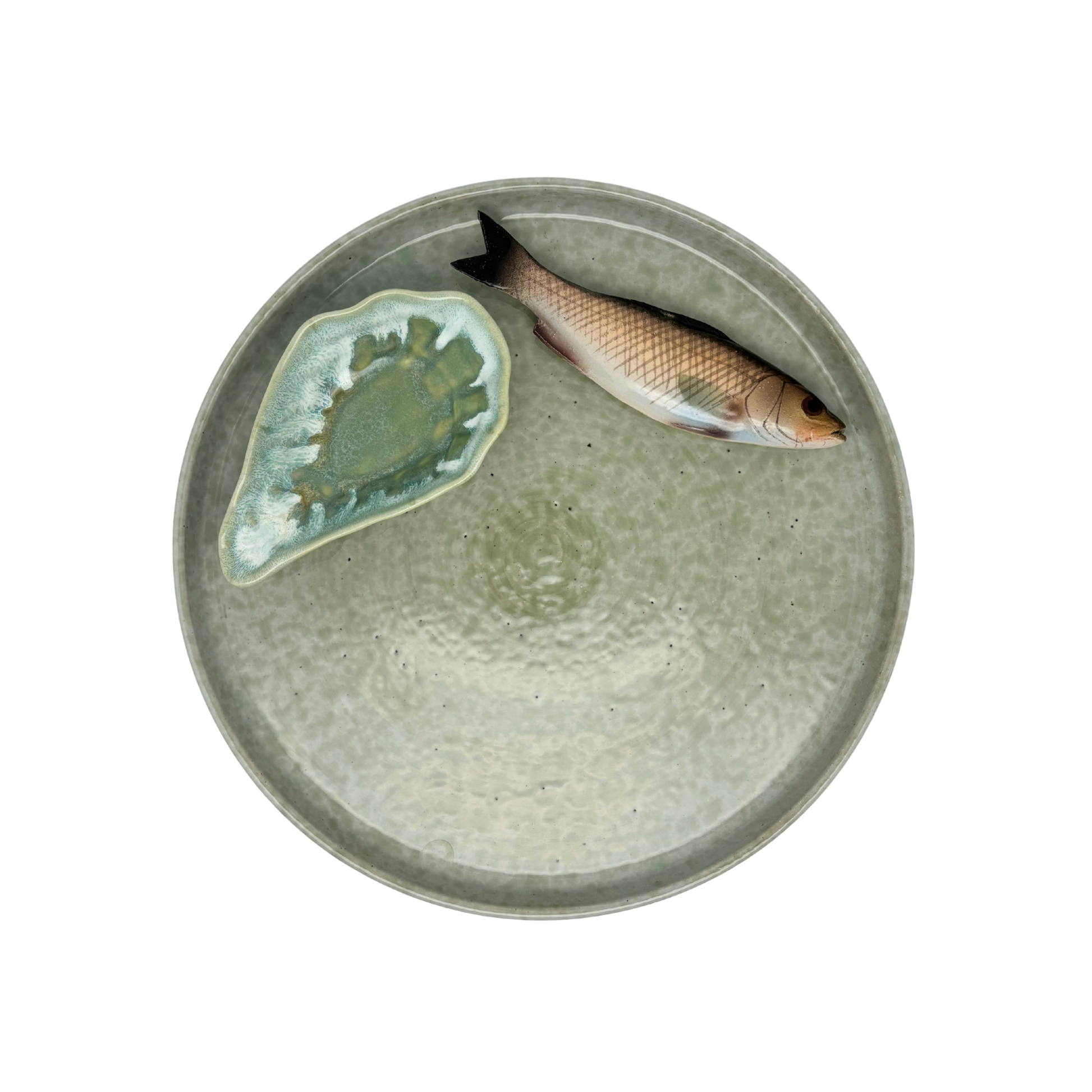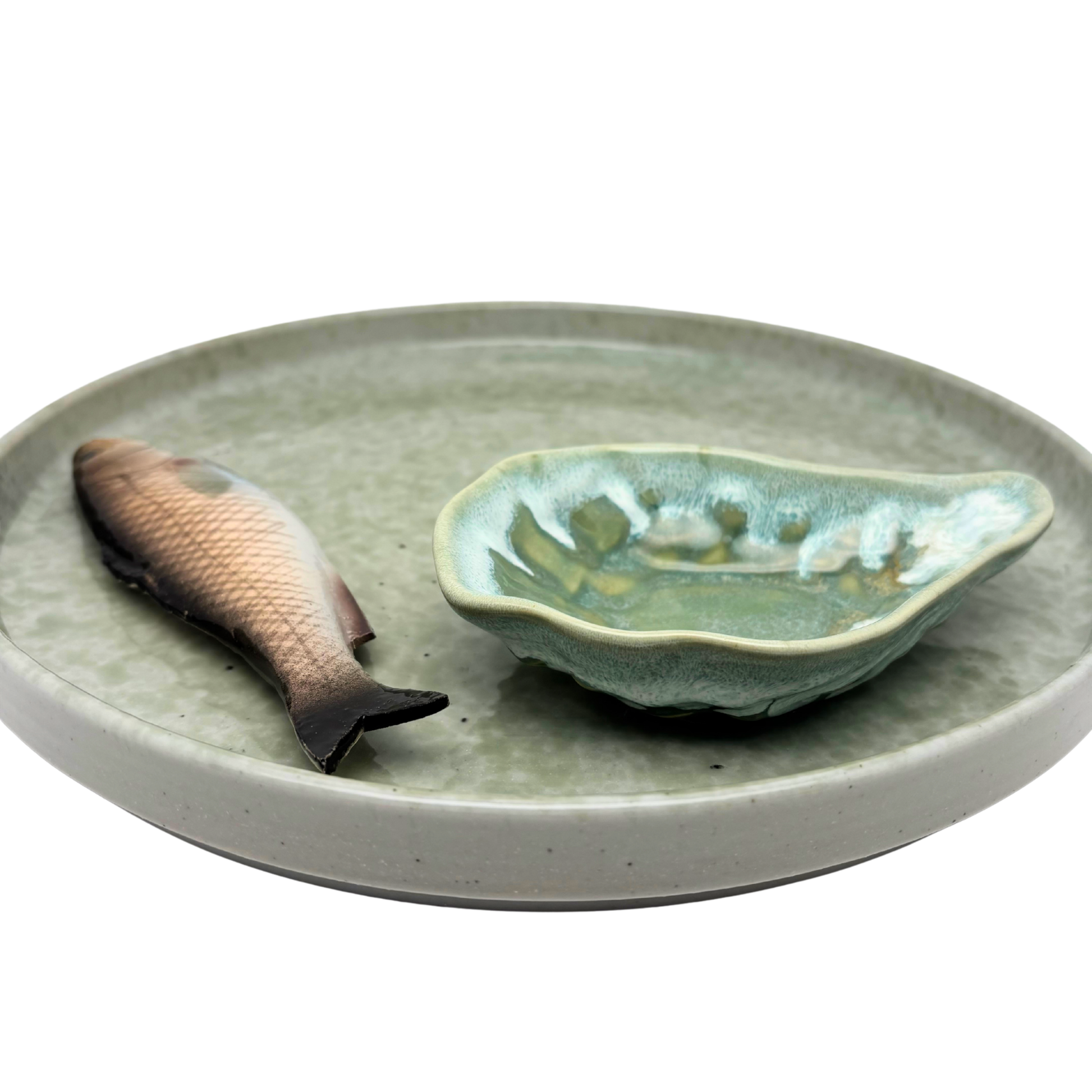 Een uniek zeegroen borrelbord (26 cm) met een Spigola medio en een schelpvormig dipschaaltje die subtiel op het bord zijn bevestigd. Perfect voor het serveren van borrelhapjes met een bijpassende dip.