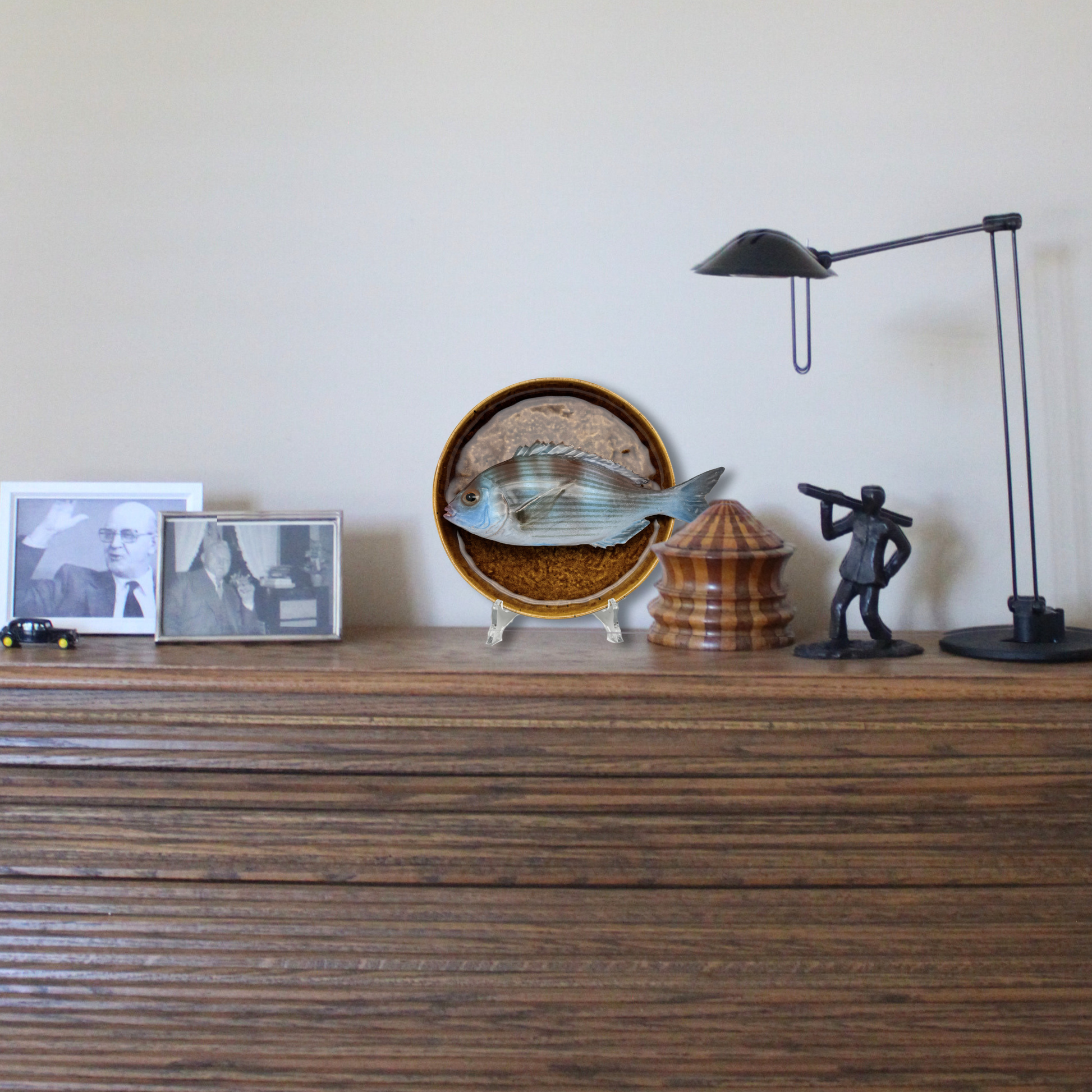 Tanuta op een donker bruin bord 22 cm rond. Aan de achterkant zit een ophanghaakje bevestigd en kan direct aan de wand gehangen worden.